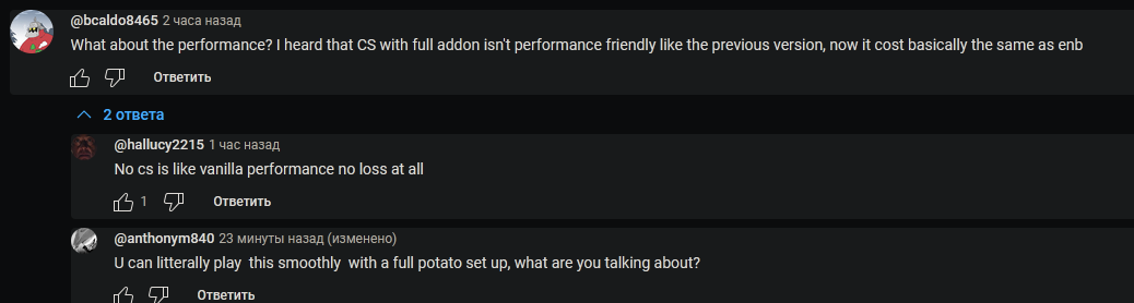 >>1973401 >>1973402 Да разрешение у монитора 2К, лол. А текстуры там вообще не особо жрущие, автор даже расписал почему. https://www.nexusmods.com/skyrimspecialedition/mods/992 Олсо, я не заметил каких-то прожорливых теней от Евласа. Единственное где падает фпс немного, это во время снега в лесу, но не критично.