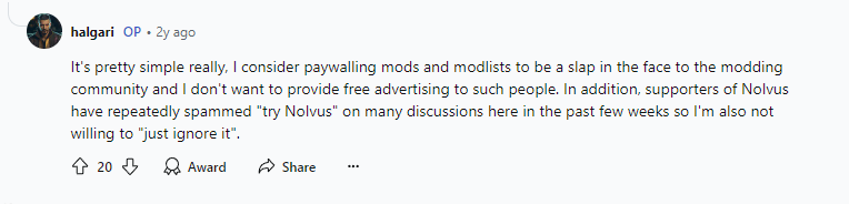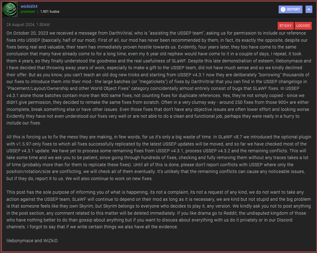 >>1975476 Нолвус всегда был не-Ваббаджек сборкой, но в какой-то момент его версия 5 оказалась за пейволом, поэтому на Нексусе был удалён общий патч этой сборки, потому что там так нельзя. Но это Нексус, при чём тут Ваббаджек? А вот, halgari (автор Ваббаджека) - давний приятель Pickysaurus (коммьюнити-менеджер Нексуса) и его самый жёсткий прикормленный подсос. Поэтому на сабреддите r/wabbajack забанили любое обсуждение Нолвуса, чисто из солидарности.