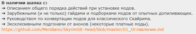 В наличии шапка с: ➔ Описанием общего порядка действий при установке модов. ➔ Зарубежными (и не только) гайдами и подборками модов от опытных допиливающих. ➔ Руководством по конвертации модов для классического Скайрима. ➔ Эксклюзивными подгонами от анонов (некоторые платные моды). https://github.com/Meridiano/SkyrimSE-Head/blob/master/01_Оглавление.md