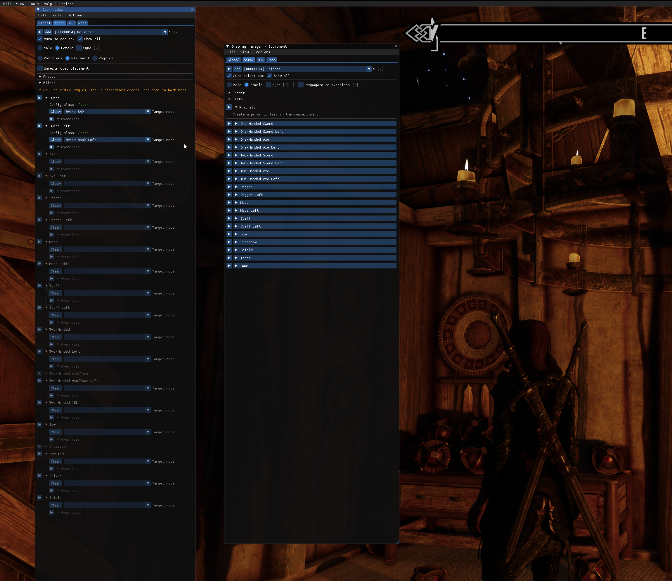 Попробовал покрутить ползунки в Racemenu — в ножнах на персонаже ничего не меняется, но меняются настройки в XPMSSE, с чем меняется и анимация доставания мечей, аналогично с оружиями других классов и работает ползунок "Скрыть меч" "Левый"/"Правый", но ножны сука до сих пор на поясе. Например, GreatSword, перемещённый в RACEMENU со спины на пояс, по-прежнему имеет ножны на спине, но достаётся с пояса.