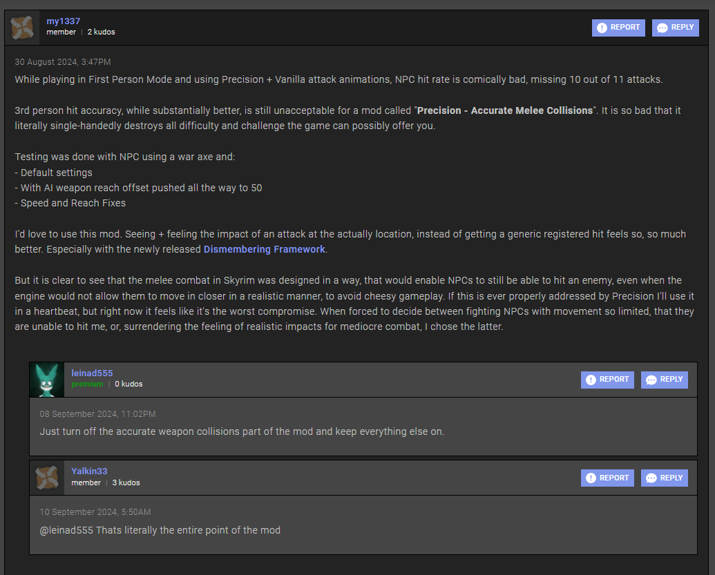 >>1975781 К сожалению базилевич, с пресиженом боевка превращается в клоунаду еще сильнее чем в былые времена с мортал энемисами. Узкий коридор + секира - хуячишь стены вместо врагов. Крысы под ногами, а в руках кинжал - ГГ не может дотянуться и ковыряет воздух. Бандит делает замах - делаешь один шаг назад и можешь идти заваривать чай, пока он в следующий раз сможет по тебе попасть. Но сука после использования и к ванильной боевке вернуться уже не получится, настолько она всратая.