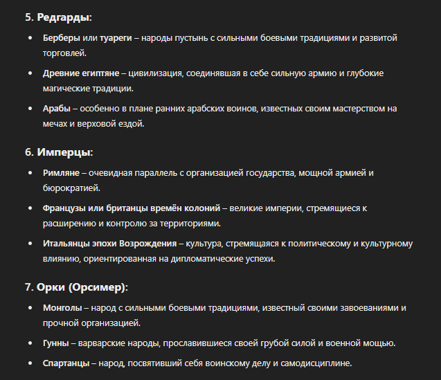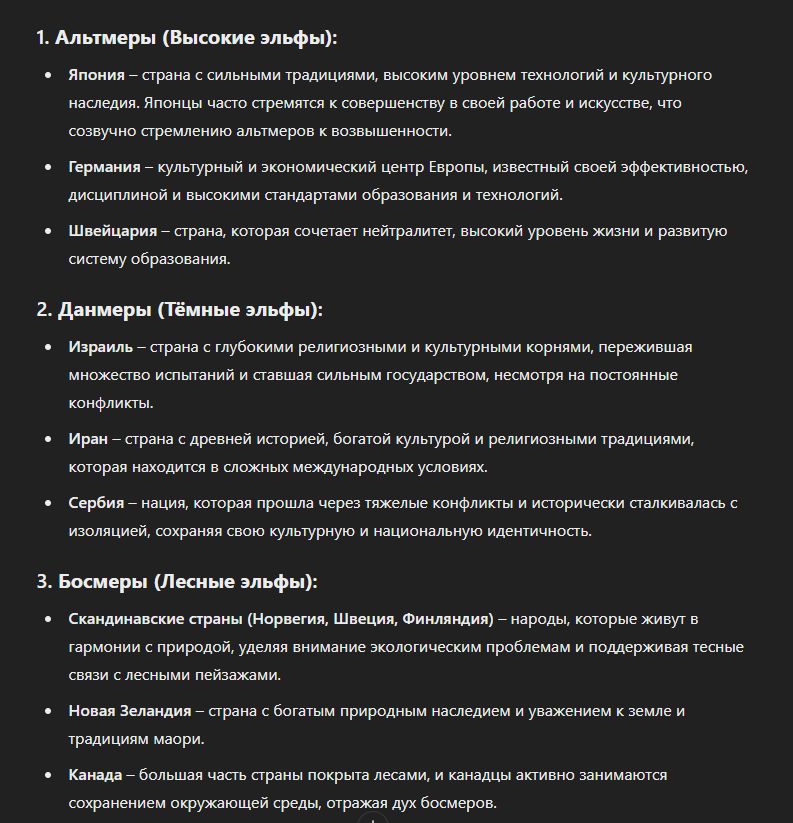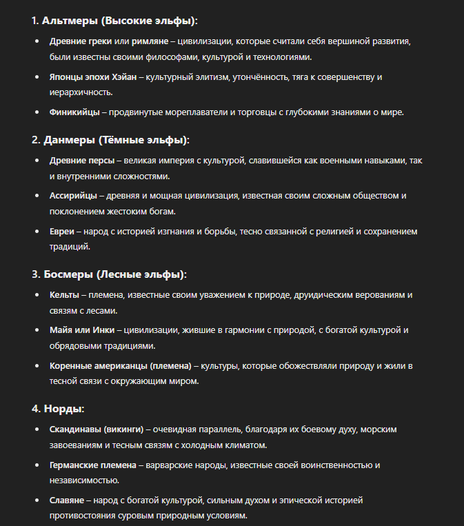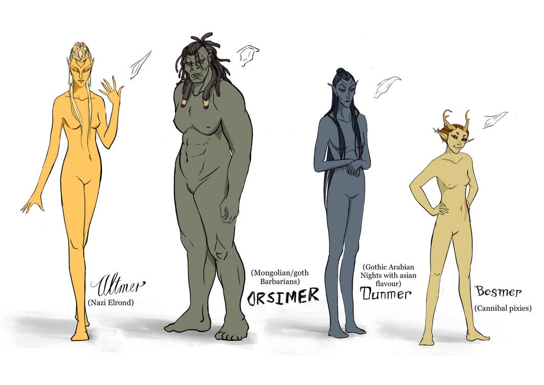 На собрании Нирна определили Альтмеры - сверхраса происходящая из гипербореи, шамбалы, атлантиды. Имперцы и бретоны - стремящиеся. Все остальные расы - поклоняются Перуну и большим деревянным дилдам в форме предков.