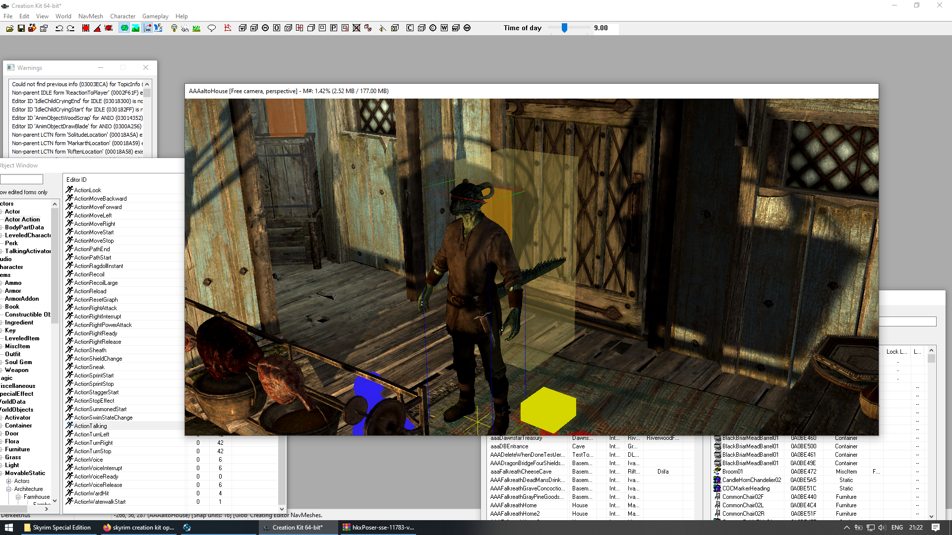 >>1978544 (OP) Посоны, а в Сreation Kit'е можно проигрывать анимации актёра в render window? Включил havok sim - играет пламя огня, а актёр как стоял, так и стоит. Пока только в edit base проигрывалась анимация, но не в окне рендера. Не шарю в СК, хотел просто поставить стол, посадить туда Деркитус, жующего хлеб, и заскринить
