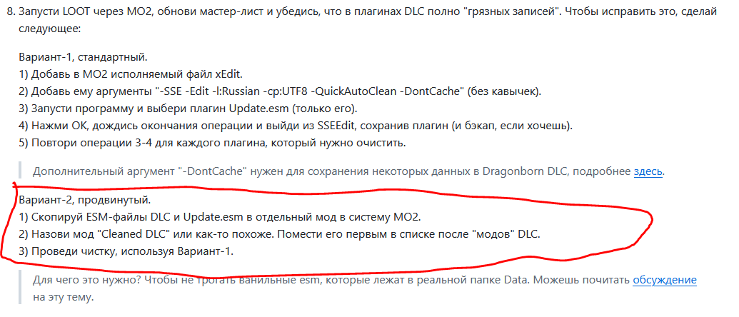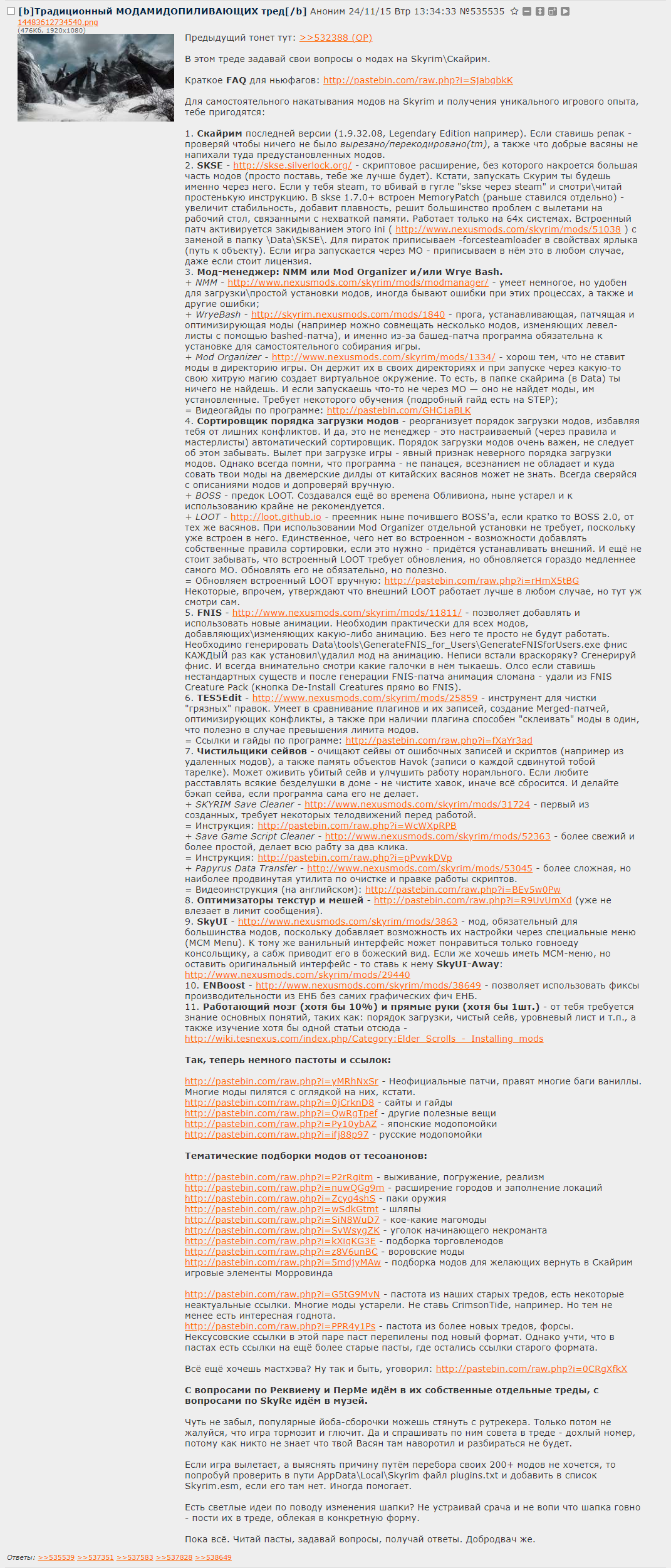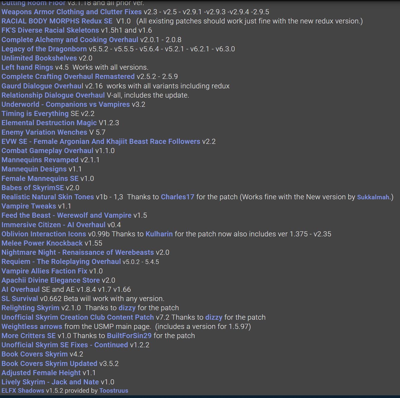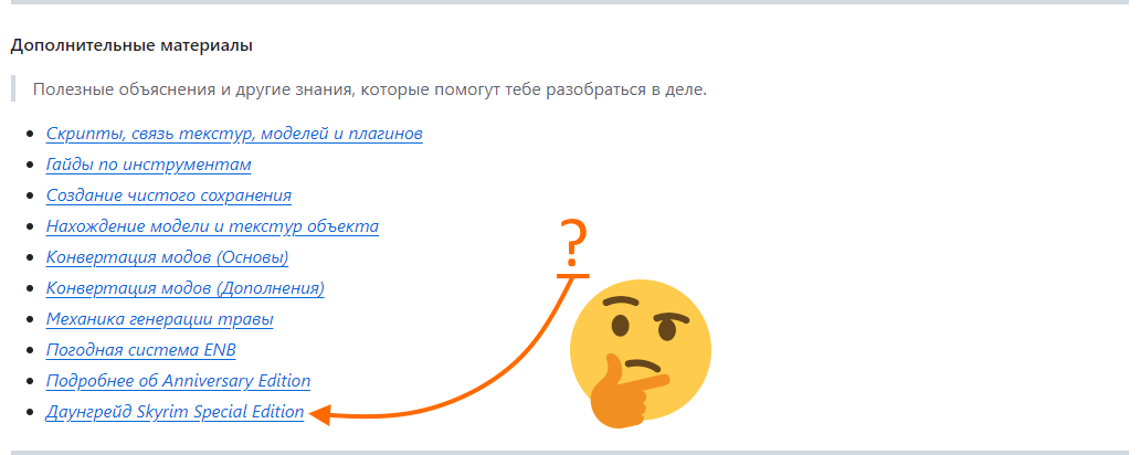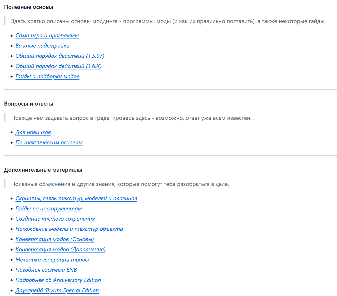 В наличии шапка с: ➔ Описанием общего порядка действий при установке модов. ➔ Зарубежными (и не только) гайдами и подборками модов от опытных допиливающих. ➔ Руководством по конвертации модов для классического Скайрима. ➔ Руководством по даунгрейду игры с сохранением нового контента. ➔ Эксклюзивными подгонами от анонов (некоторые платные моды). https://github.com/Meridiano/SkyrimSE-Head/blob/master/01_Оглавление.md