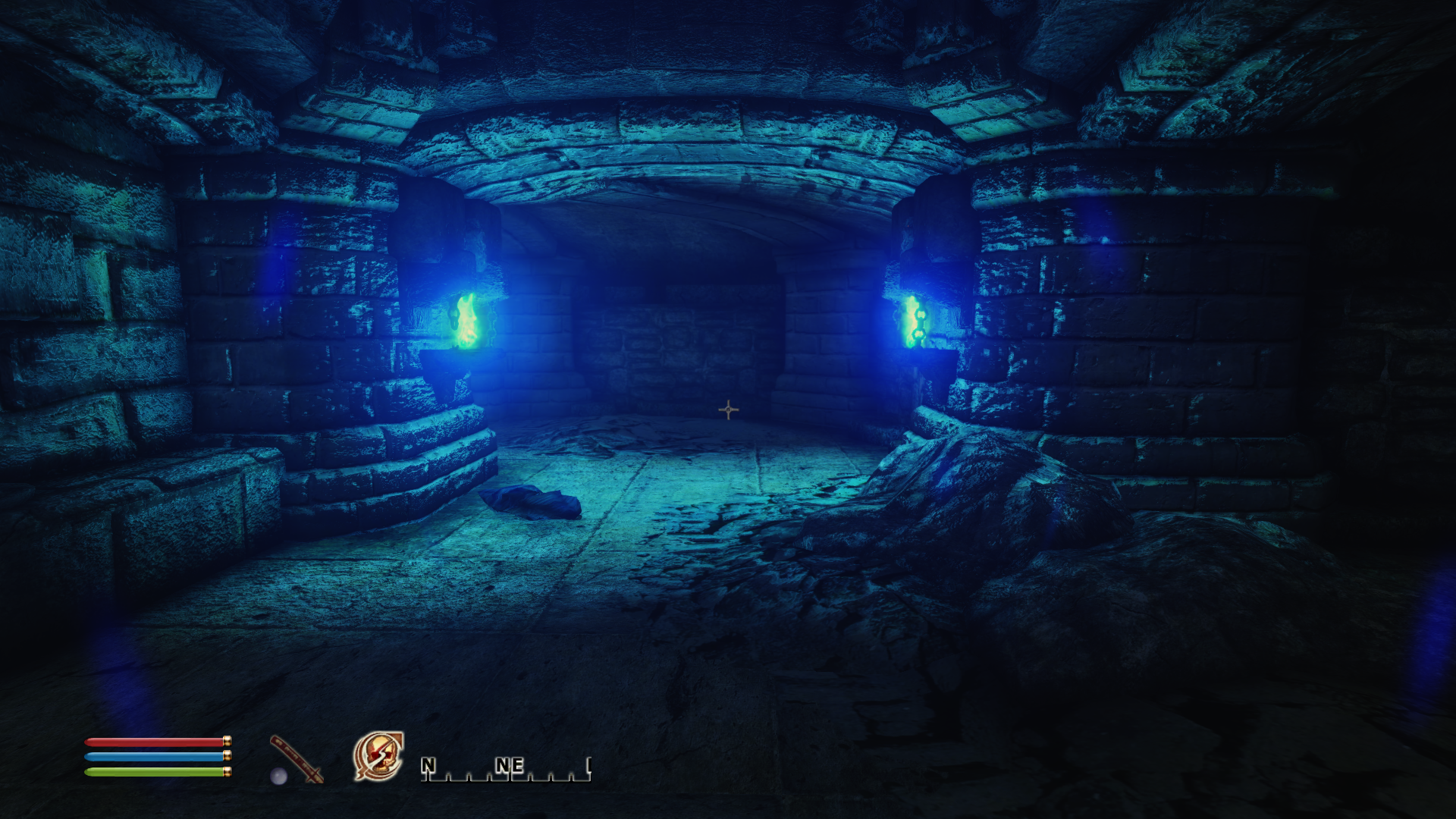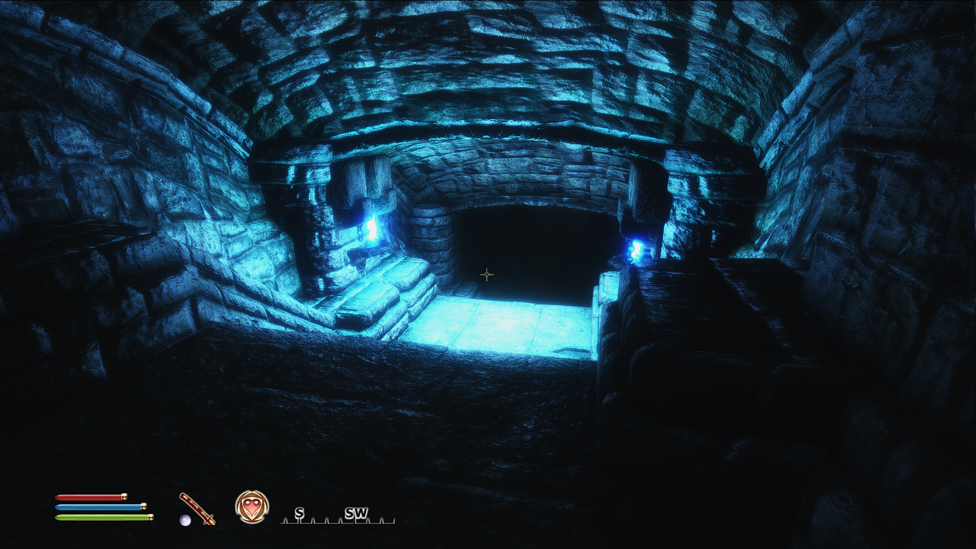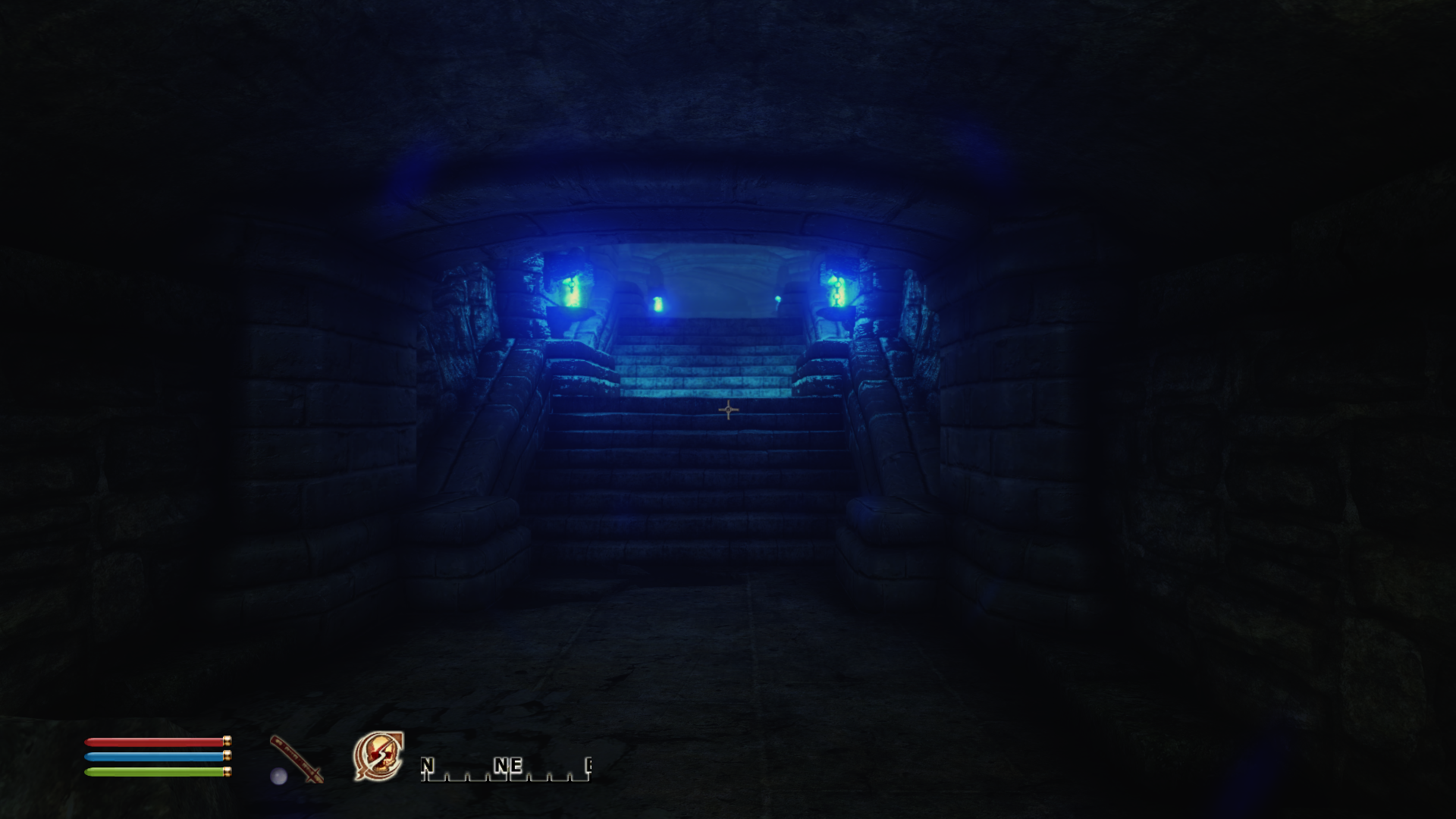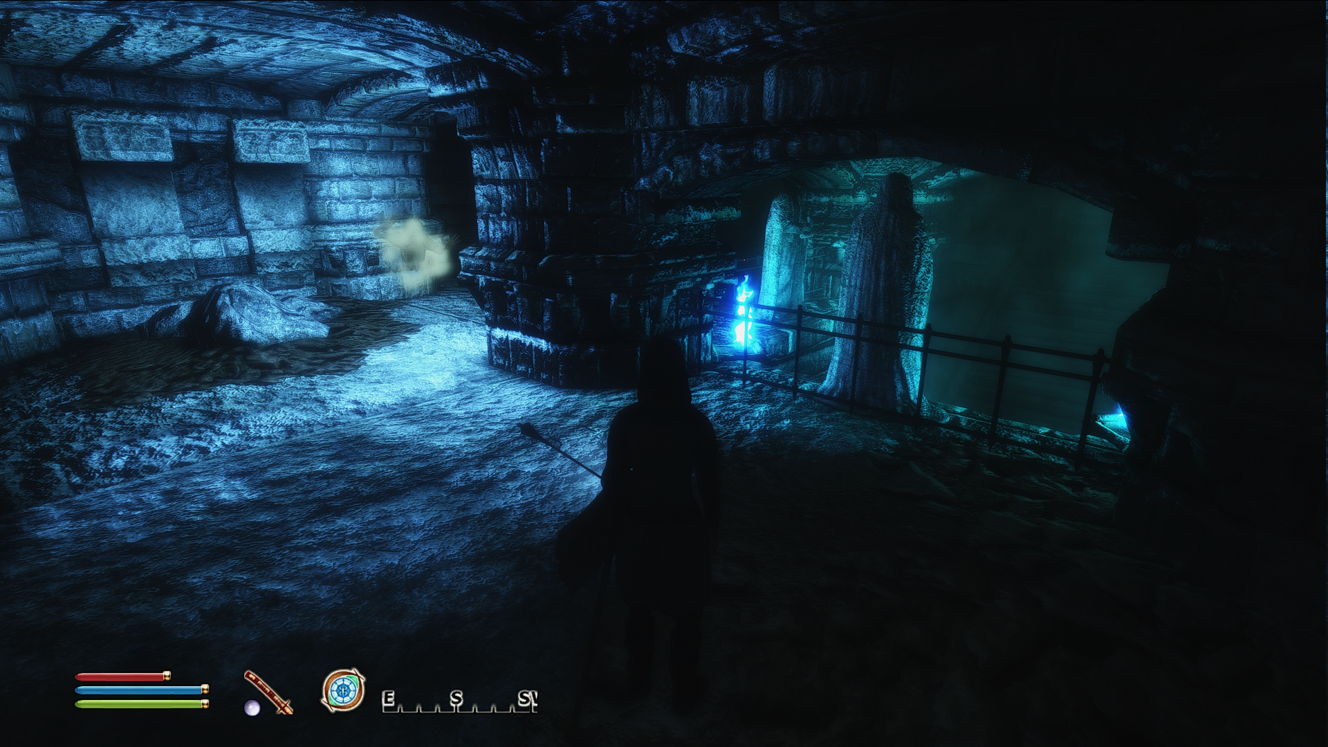 В стартовом подземелье. Там где вот этот вот зал с ручьём фекальным, где два мостика - две агрессивных крысы. Заклинания "Лечения", зелья "Лечения", зелья "Щита". Когда здоровье кончается бежишь в сторону выхода. Там значит зал, слева лестница. Поднимаешься по ней. На площадку. Выход на права по мосту, а ты прыгаешь налево на стену. Над проходам к канальям такой выступ. Там можно зацепиться и в безопасности восстановить здоровье и магию.