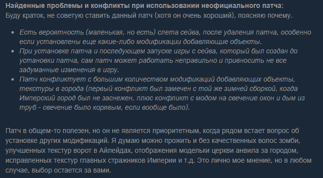 >>1982000 Ну, с одной стороны, вроде бы и васянка, ибо технически этим и является (буквально сборка модов). С другой, некоторые отдельные части этой сборки вполне неплохи - в частности, вырезанные куски Имперского Города, тот же тоннель в ванили тупо телепорт - да и в целом города оно неплохо оживляет. Ванильные, как по мне, в этом плане всё же пустоваты - за исключением того же ИГ, на улицах вообще нихуя нет. Это простительно какому-нибудь ЕСО, где дохуя васянов по дейликам на конях прыгают, но в случае с облой лично мне как-то прям вообще не заходило. Не чувствуется сам город как концепт, хз.
