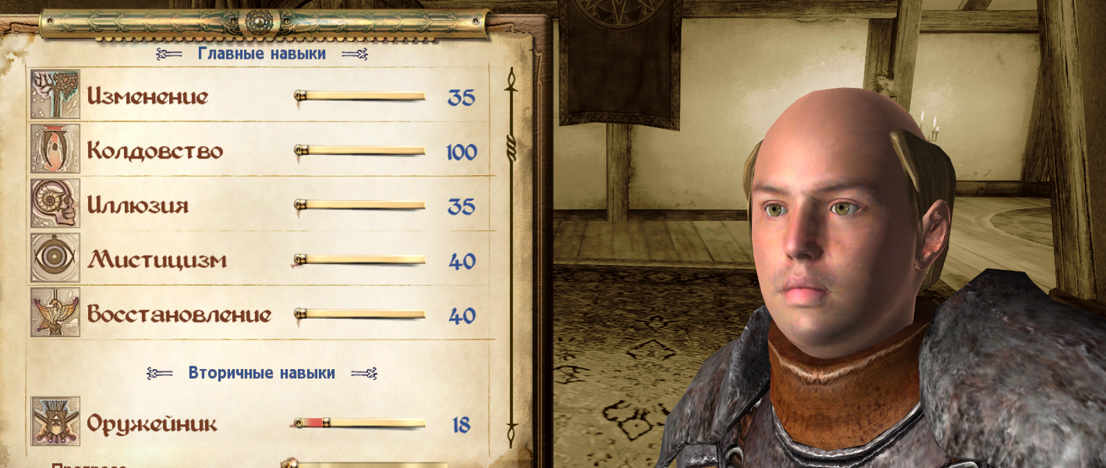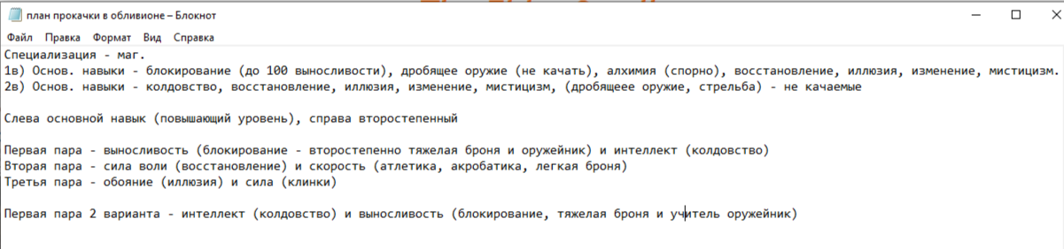 Задумка такова, что я буду качать один основной навык из первостепенных и любой из второстепенных. Приоритет это интеллект из-за колдовства, потому что призывные чертики ебут автолевелинг, а так же выносливость из-за хп. Затык произошел как раз в начале из-за колдовства.