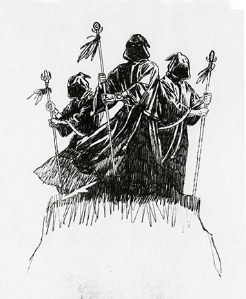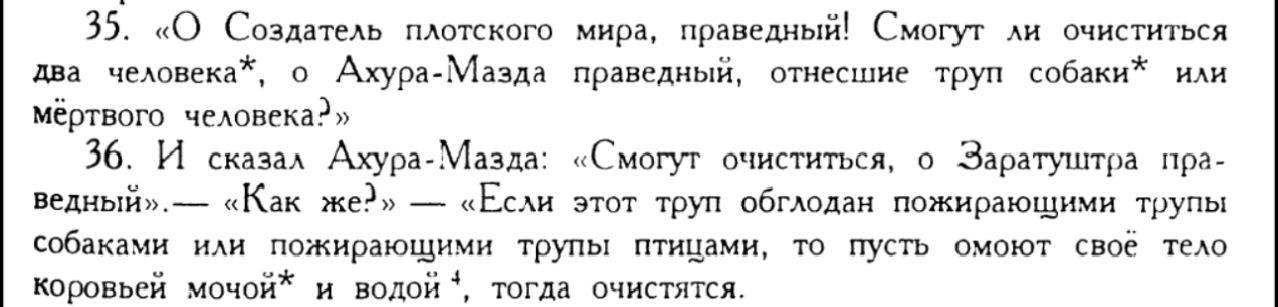 >>1985223 Коровью мочу нальешь ты в сосуд железный или оловянный; трость 9-узловую возьмешь ты, о Заратустра, к ней прикрепишь ты оловянный сосуд. Руки обмоет сначала 3 раза очищаемый; и когда окропишь водою его лоб, друкш-нашус спустится вниз и поместится между бровями этого человека. Окропи тогда межбровное пространство, и друкш-нашус бросится на затылок его…». — Последовательным окроплением члена за членом друкш вытесняется все более книзу, пока наконец не будет загнана на кончики пальцев левой ноги. «И когда окропишь пальцы левой ноги, друкш-нашус вытеснится по направлению к северу в образе мухи, злобно нападающей с громким жужжанием. И тогда произнесешь ты вечные слова yathâ ahû vairyô». Обливание повторяют у каждой из 9 ямок; потом очищающегося 15 раз обтирают песком и окуривают благовонными растениями. Этот порядок повторяется 3 раза: по прошествии 3, 6 и 9 ночей; после чего уже можно приближаться к огню, к воде и т. д. (Вендид., VIII, 117—228; IX, 1—145).