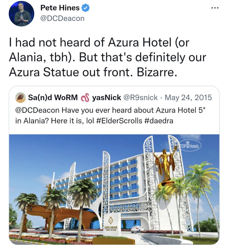 >>1982497 Тодд в доле. Хайнс сказал что не в курсе, лол вспомнил как Беседка судилась с создателями Майнкрафта за название, а тут турки из Хлаалу умыкнули целую Азуру.