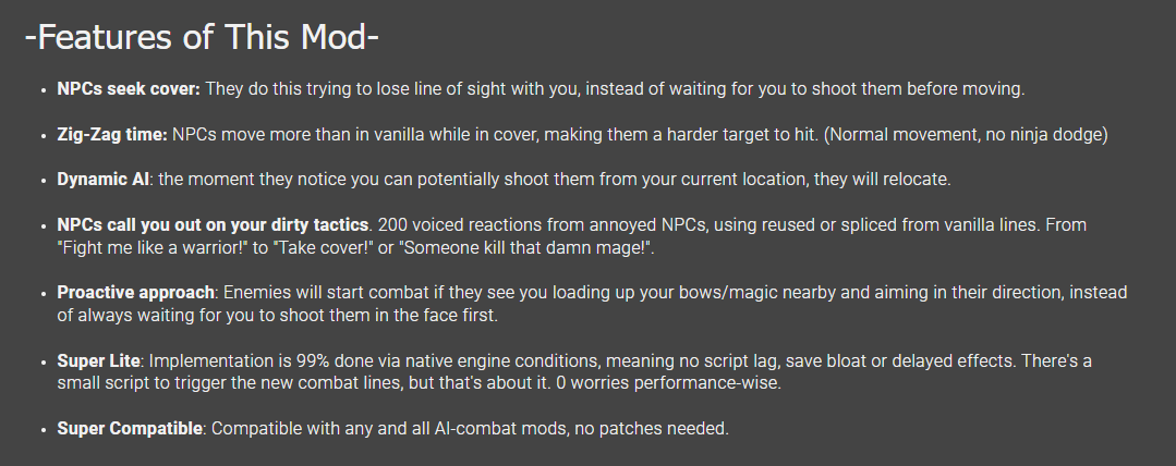 >>1983698 This mod makes NPCs smarter and capable of dealing with the most cheesy strategy Skyrim has ever seen: shooting NPCs from locations they cannot reach. They will now hide properly and relocate if necessary, while also shaming you for using dirty tactics (with 200+ voiced reactions!)
