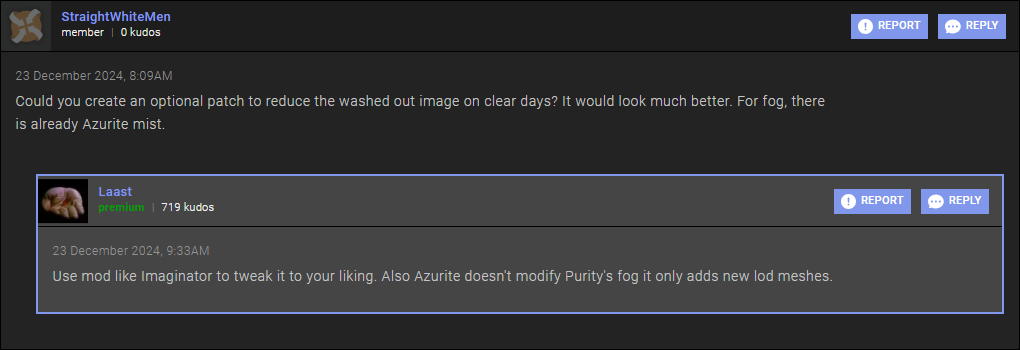 Но суть в том, что он не убирает туман, который автор Пурити нахуячил в чистую погоду. Это всё равно что генерировать анимации при помощи Wrye Bash - слова есть, а смысла в них нет. Лааст просто бредит.