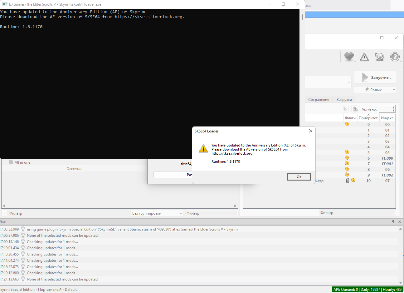 Поставил все по гайду из шапки. Версия SE. Получаю такую excited. Что-то само обновилось, ничего не работает. Скачал версию skse для АЕ, установил, все равно не работает. Что вообще не так с игрой, что для ее запуска нужно дополнительно скачать СЕМЬ отдельных вещей?