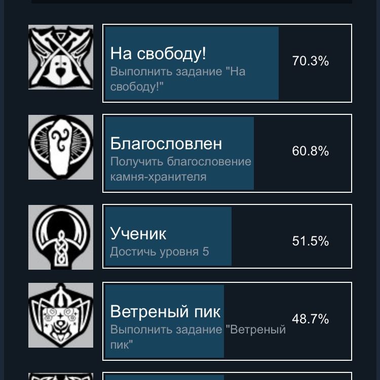 Сегодня зашел глянуть ачивки в Скайриме и прям таки охуел. Сколько там копий продано в стиме? Грубо говоря, каждый третий купивший игру в стиме так и не вышел из Хелгена, то есть, посмотрел пролог и вышел. Чуть больше половины людей осилили пройти 1 минуту и добраться до первых камней-хранителей. До 5 уровня докачалась половина всех игроков, нахуй. И примерно столько же зачистили Ветреный Пик. Дальше, естественно, все еще хуже - каждый третий купил квартиру, каждый четвертый вступил в Соратники, каждый пятый дошел до талморского посольства, каждый шестой выбрал сторону в гражданской войне, каждый десятый построил 1 дом. Почему так, нахуй?