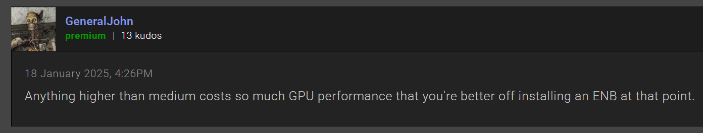 >>1989156 Вот именно по этому я и заинтересован в этих шейдерах, на моей старухе 570-8 особо не разгуляешься с ENB это при том что я особо ресурсо емких модов не накатываю, разве что трава. Просто хочется довести освещения до современного уровня и улучшить то что уже имеется, из графики я максимум только траву ставлю, деревья последний раз не трогал, они в SE по гуще чем в LE и с лодоми по проще