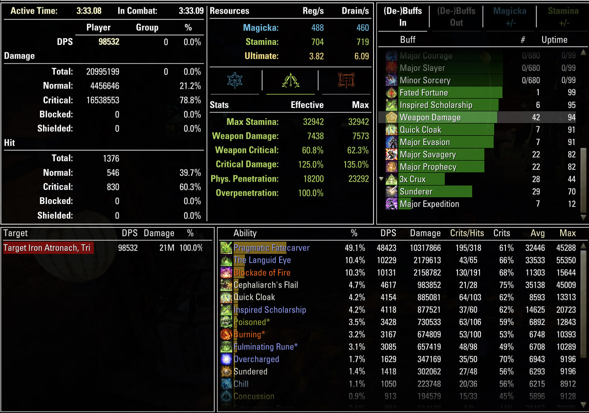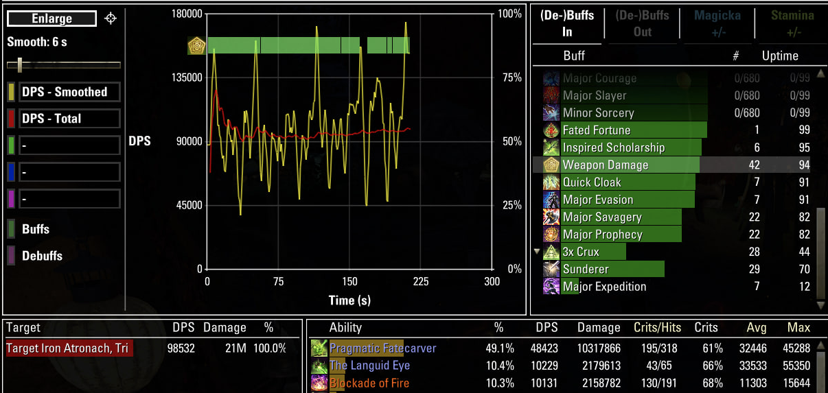 >>1988511 > в люди выходить все же хотелось бы имея хп, чтобы не отлетать с одной тычки Да, в контент обычно берут стамину + хп. > с пугами под баннером сустейн иногда проседает А, тогда стамину + хп + стамреген можно понять. > На кукле же ОБ прокается автоматически, как "групповые" дебаффы, самому ничего делать для этого не надо? Совершенно верно, прокает в момент начала боя и дальше по кд. У куклы есть занятная багофича - если ты начнёшь бой и ресетнешь её, то при респавне кд ОБ сохранится. Т.е. при грамотном ресете куклы перед парсом ты можешь сделать так, что ОБ во время опенера прокнет ровно тогда, когда ты прокинешь все доты и будешь с тремя круксами, т.е. ульта + луч ударят в ОБ, что бустанёт итоговый парс. Мощный опенер нужен для того, чтобы как можно скорее дойти до 90% хп цели, тогда начнут работать трейты бижи. По этой причине сорки в парсах и используют ебейший пребафф - для максимального бурста и достижения 90%. > ее аптаймить прямо по кд приоритетно после луча Это. Она тикает раз в секунду, этот энчант под трейтом имеет кд 4,5 секунды, т.е. за 1,5 секунды до её истечения энчант прокнет, и у тебя будет 3,5 секунды запаса на обновление. Можешь, конечно, трекать эффект энчанта (Srendarr в помощь), но это настолько заёбно, что проще обновлять дорожку сразу после того, как она и каст луча кончились, так проще и правильнее. > Соображение было такое что дамажить он будет разве что бернингом Там все 3 статусника дамажат. Собственно, огненный энчант с оружия заменяют, т.к. бёрнинг уже будет со скилла, а абсорб стамины при проке статусника даст 100 впд / спд. > Теперь понял, почему они все делают галку из мебели перед куклой, кек Именно. > статью схоронил на случай если сайт кончится Не должен, Варлав проплатил хостинг на год. Текст на минуту чтения и живой сайт против 40 минут нытья и нюкнутого сайта, почувствуй разницу.