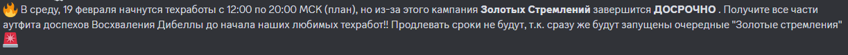 >Но мне кажется, Зосы как-нибудь впихнут награду между имеющимися. Нихуя. Пару раз они так уже продливали техработы - давали ровным счётом нихуя из-за этого. Максимум что делали - продливали ивент на один день, если техработы затягивались во время него