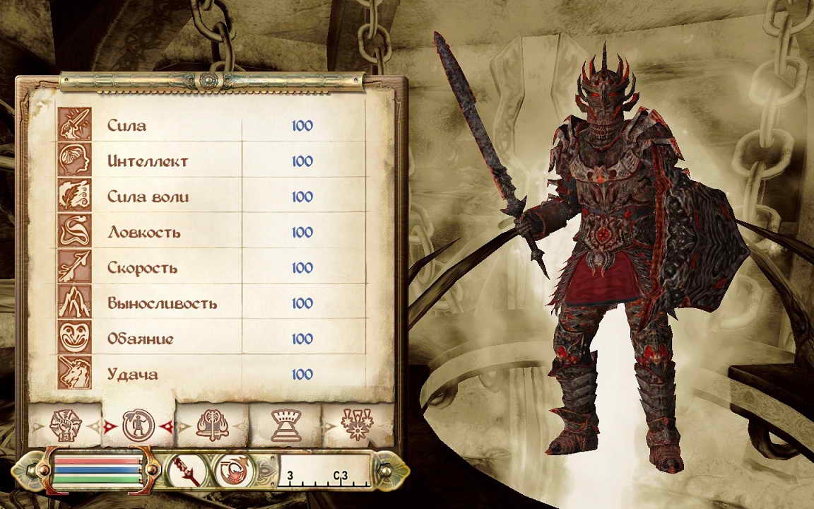 Атлетика 106 Клинки 100 Блокирование 100 Дробящее оружие 75 Тяжёлые доспехи 100 Изменение 100 Разрушение 100 Восстановление 100 Акробатика 111 Стрельба 100 Торговля 44 Взлом 19 Скрытность 55 Красноречие 5 - Какой я не общительный.