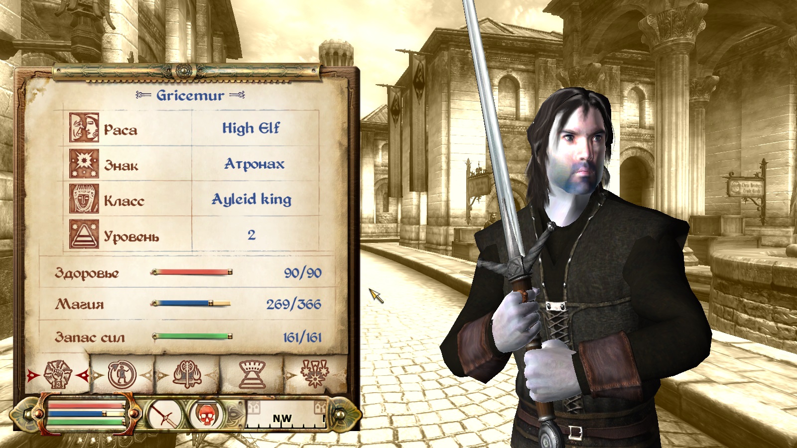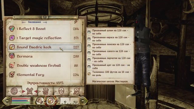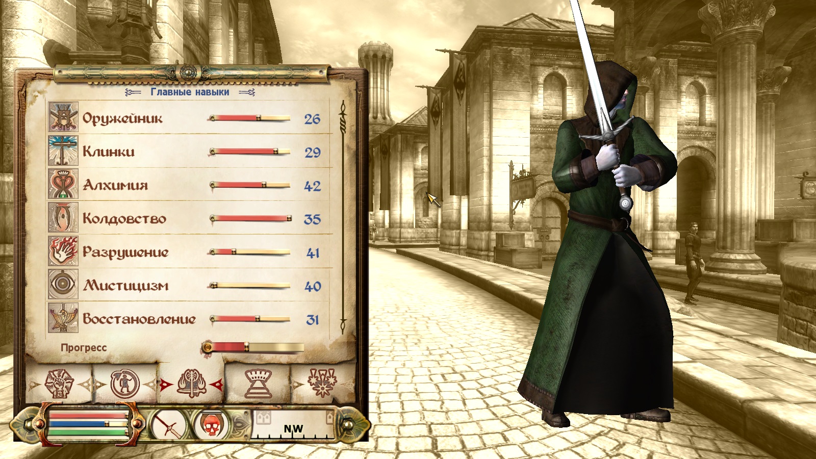 Оружейник 89 Рукопашный бой 51 Алхимия 77 - Сюда надо было ставить "Красноречие". Колдовство 100 Иллюзия 40 Мистицизм 100 Лёгкие доспехи 63