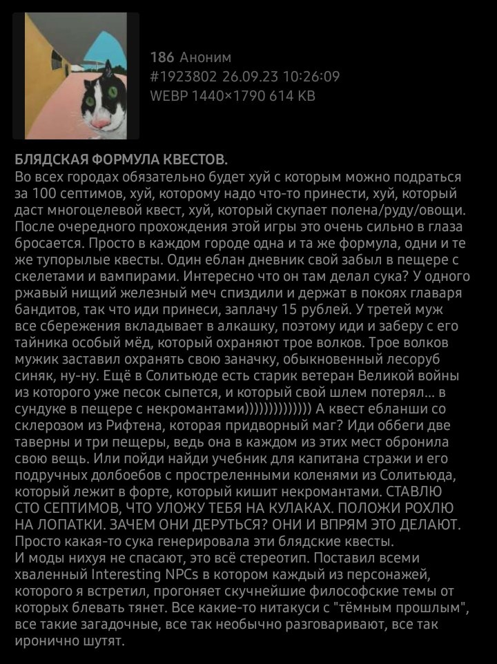 Году в 2015, кажется, впервые сыграл в подливион после всех остальных номерных тесов, исключая Арену, забрав сборку с OOO на торрентах, ссылку на которую получил в тесаче. Хотет повторить, дайте плез готовую сборку без анлорщины и с оверхолом, можно ту же самую, хоть наверняка давший ту ссылку анончик уже от ветхости погиб. Дёрнуло меня чёт в Elder Kings набежать, а после него понесло мудями трясти по оригинальной серии, но в ваниль играть сил уже нет никаких, в каждой части и так уже часов по пятьсот аутирования наберётся. С модами только самостоятельно ебстись больше не выйдет, после нескольких дней обмазывания уже совсем играть перестал. Так выглядит старость, видимо.