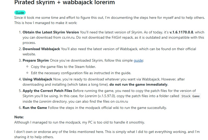 >>1991308 изменилась как минимум нужная версия скайрима. Я вкатился в это дело полтора года назад. Полгода оно работало, потом пришлось обновить ваббаджек изза сломанной интеграции с нексусом, и все сломалось. Благо добрые люди подарили лицуху.