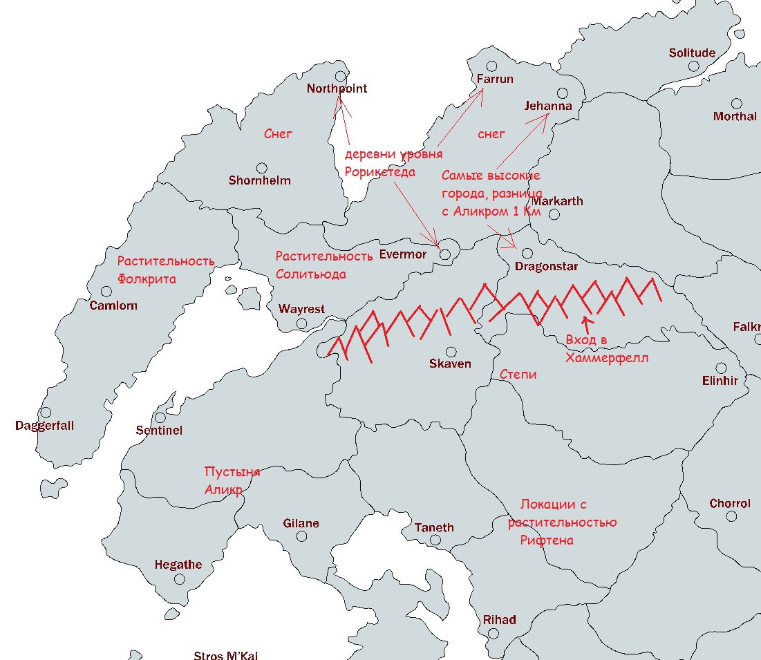 Будет Хаммерфелл (возможно его часть) и Хай Рок. Хай Рок мы видели в тизере. Города будут чуть больше, чем в старфилде, примерно 12 штук. Реально крупных будет 3-4, Даггер, Сентинель, Танет и Рихад. Мелкие поселения будут оправдывать ну мол война была, все разрушили.