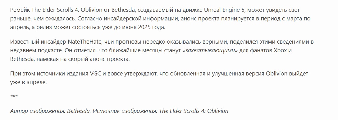 >Скорее всего придется выбирать сторону, как в гражданской войне Скорее >и делать одинаковые квесты, только находиться будут разные предметы, необходимые для строительства. Это тебе Тодд лично сказал? >В итоге башня строится, доминион штурмует башню, случается прорыв дракона. ГГ улетает в лимб по типу концовки старфилда, там (предположительно) аэдра говорят, что произошел прорыв, ты можешь выбрать либо попробовать вновь найти верный вариант, либо остаться в этом варианте. Ведь как говорилось кем-то, что аедра всегда найдут способ оставить эту кальпу целой. В нынешнем варианте появляется энд-гейм арена, где нумидимум разнес хаммерфелл на острова и там воцарилась полная дурка. Будет что-то типа новой Эры Рассвета. Все будет генериться, все время будет что-то новое. Как раз генератор в старфилде для этого и обкатывали. Ебать, что я прочитал >Лично я считаю, что влияние МК на игры серии до сих пор велико, в Скайриме его влияние было даже больше, чем в Обле, поэтому можно ожидать какой-то реальной лорной жести в контенте, который будет предназначен для реальных фанатов серии. Кто тебе сказал что киркбрайд вообще прикоснется к этому проекту? >Ведь эта часть будет все-таки последней. С фига ли??