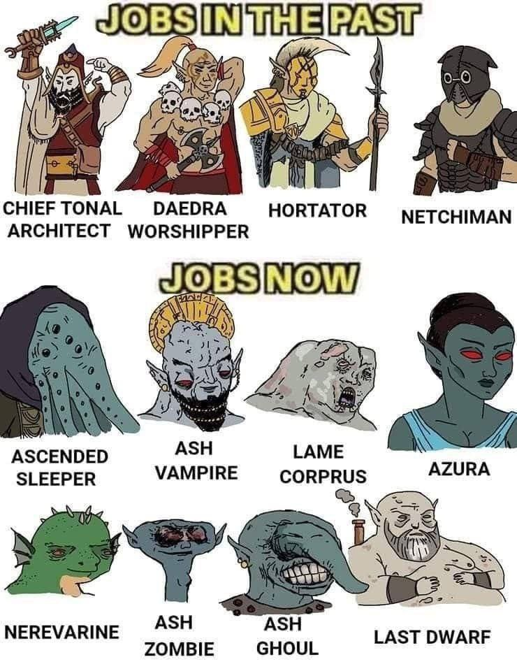 И по Тамриэлю это кстати тоже заметно, за тысячи лет никакого прогресса, нихуя. Потому что, во первых, чрезвычайно суровые условия, которые развитию НЕ способствуют, а мешают, а во вторых тем кто гаввах собирает прогресс смертных не нужен, им нужно чтобы как норды сидели в груде камней, построенной еще дидами и благодарили Шора за прекрасное существование. Двемеры вон в развитие попытались, быстро их осадили.