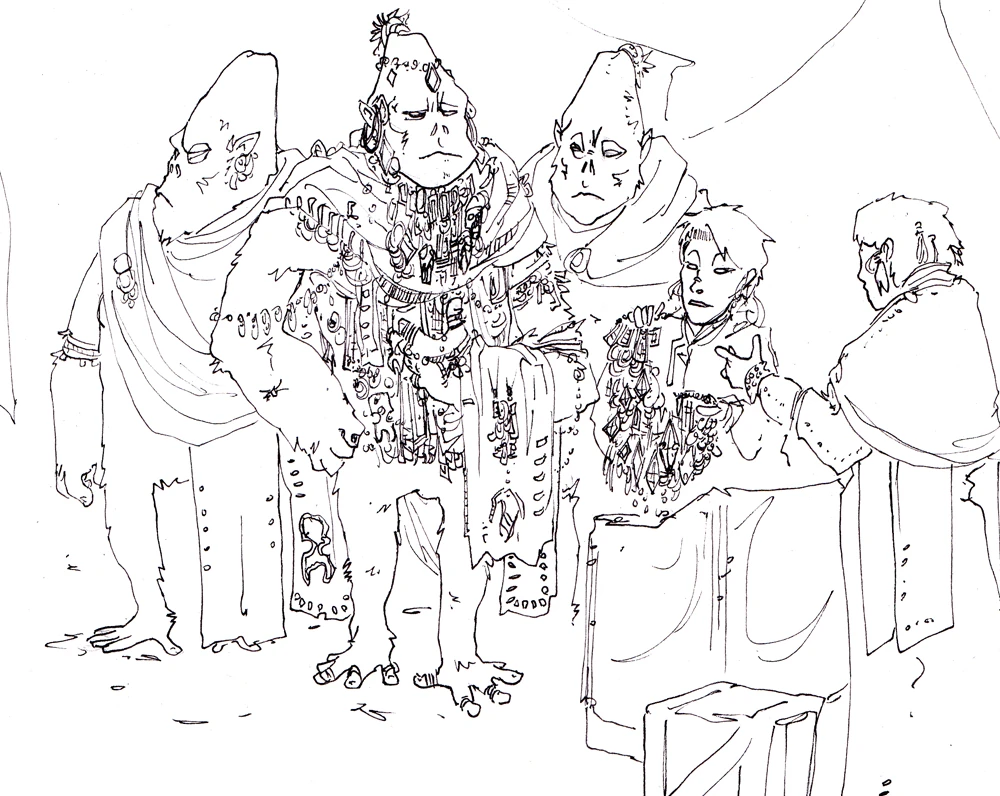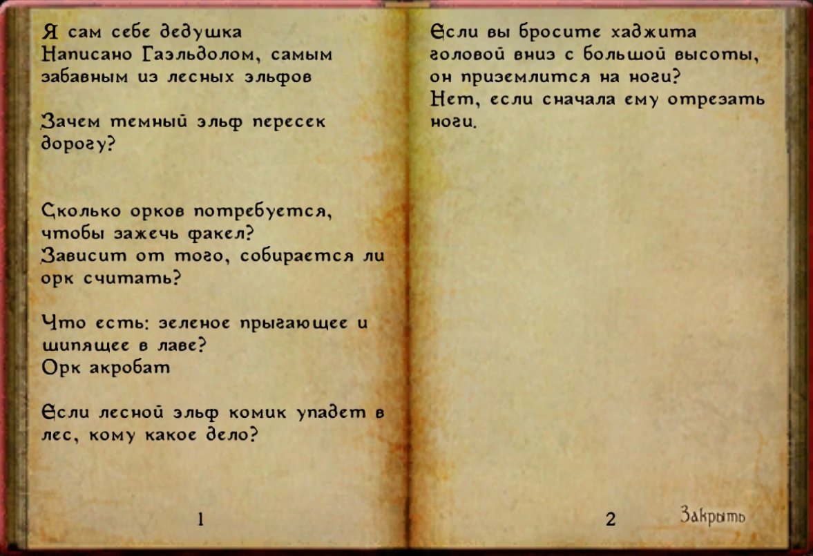 В таверне: , где это тебя так отделали?! - Проклятый Ра`Жид перешёл мне дорогу, вот меня в подворотне поймали, избили и ограбили! Голос с другой стороны стола: - Ра`Жид не виноват, что глупый Посос Орал не понимает намёки!