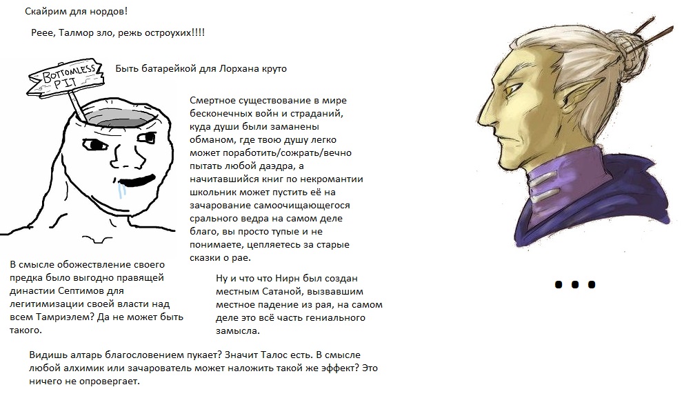>Ночь Слез Вообще странная хуета. Якобы фалмеры напали на мирный город мигрантов чтобы украсть Око магнуса и истребить людей. Напали, всех порезали и ушли. При этом око на месте в Саартале, следов битвы нет, вокруг драугры атморских шаманов. Просто тупо сошла лавина и похоронила город. Из чего следует более правдоподобная версия что "мирные мигранты" сами хотели использовать око для завоевания Фалмериса как швитой гигагерой Фалос позже использует Нумидиум когда не сможет стандартными методами покорить "слабых, изнеженных альтмеров", но не смогли контролировать его силу и оно само хуякнуло по всем сразу, включая самих атморцев, как в квесте гильдии магов. А сказки про Исграмора с его 500 спартанцами уничтоживших абсолютно без следа целое королевство так, что даже руин не осталось только пьяным нордам в таверне рассказывать.