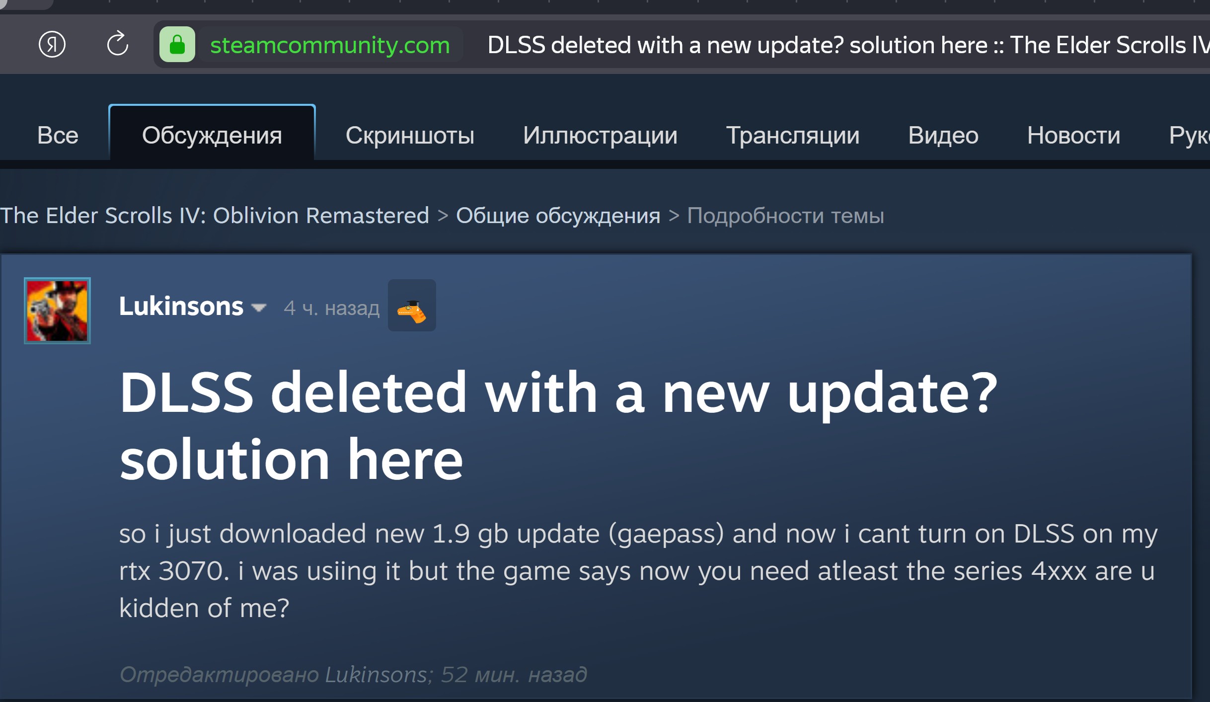 Ну пиздец. Свежий патч отключил возможность DLSS, FSR с фреймгеном на видеокартах 30й серии. Теперь либо в нативных 1080p с 20 кадрами либо люмены отключать и настройки до средних скручивать. >>2003037 Пиздец, кстати глупо, что эта точка прямо в метре перед их лицами, хотя подразумевается что ты подслушиваешь про их тайные делишки.
