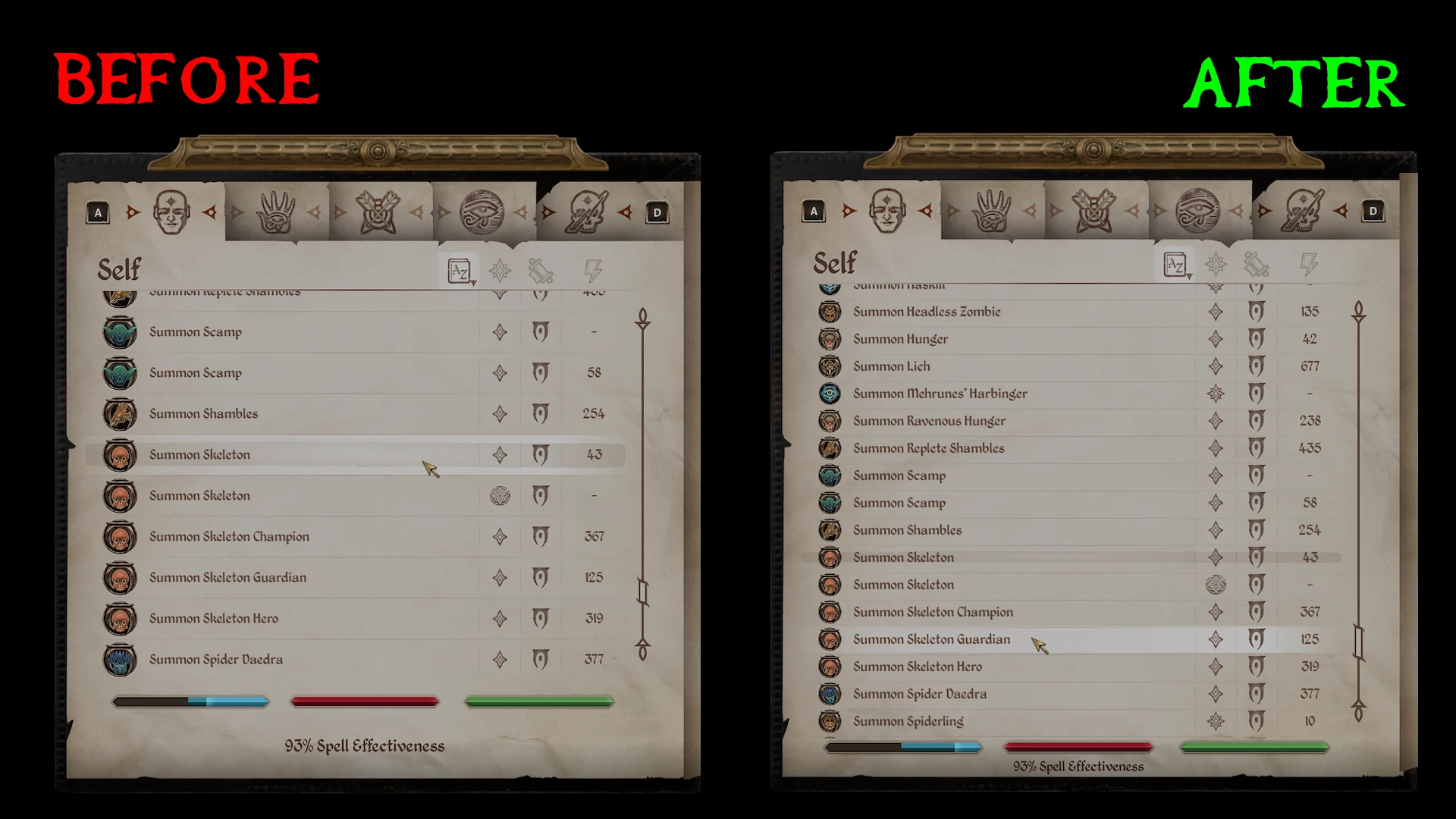 Кстати, для удобства навигации, кастомные заклинания лучше называть с символа . Например не Fortify Armorer, а Fortify Armorer, тогда оно появится прям сверху в списке.