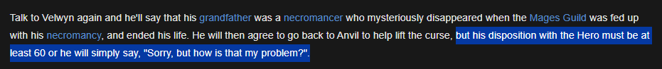 >>2008092 >Как вы играете в Облу? Открываю https://en.uesp.net/wiki/Oblivion:Quests и делаю всё по списку, кроме основного квеста. 36 уровень, в Кватч ещё не ходил. Некоторые квесты вообще в старой обле не делал, т.к. не знал что они существуют (или не знал условий, типа "отдохнуть в городе 2 дня" и т.д.)