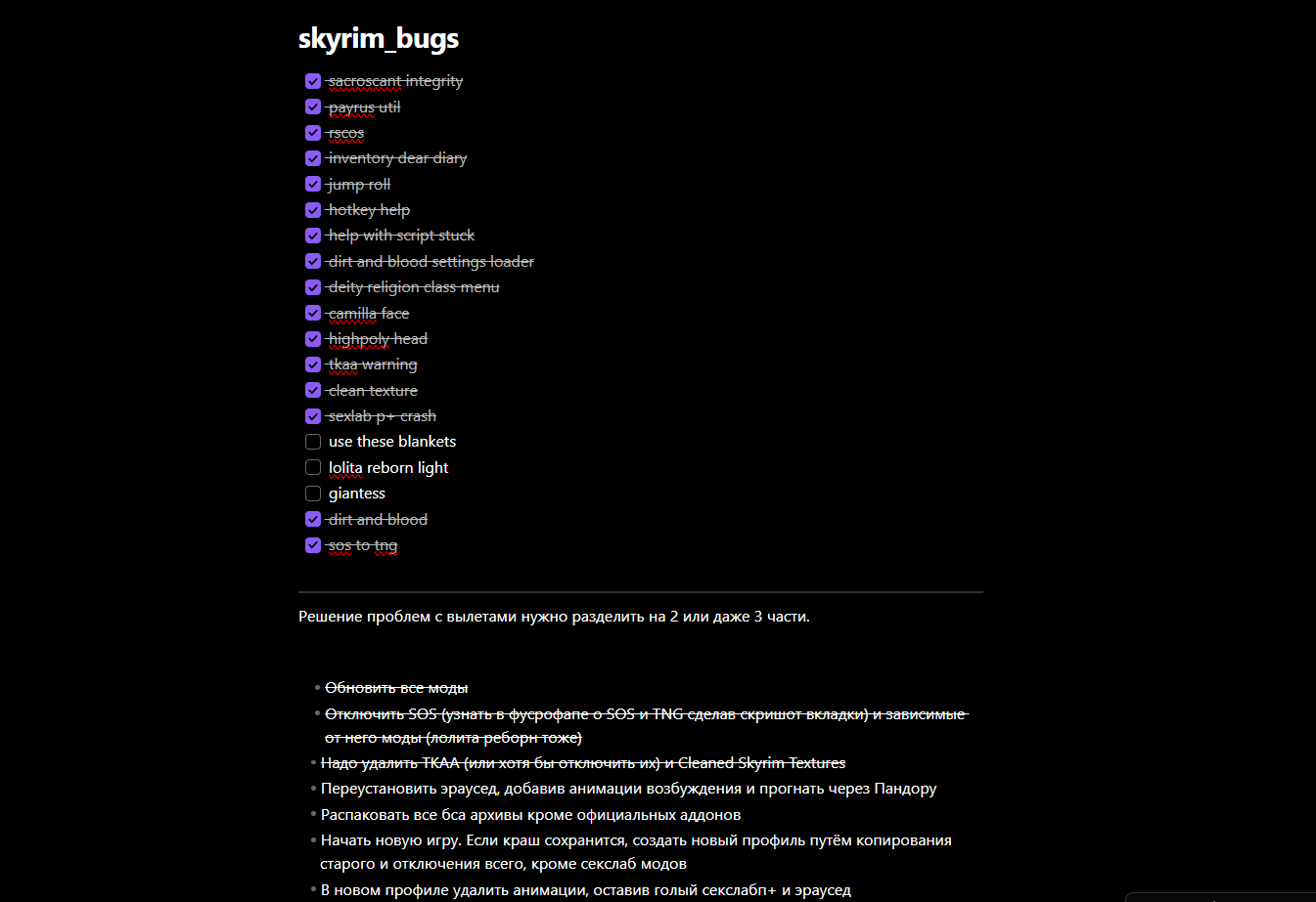 1) Скопировать текущий профиль МО2 и обязательно выбрать его 2) Отключить ВСЕ моды. Затем включить только сксе, энжн фикс, пандору и всё 3) Включить только секслаб, секлсбр+, эраусед, конверсии 4) Пройтись Пандорой 5) Начать новую игру и посмотреть на интерфейс секслаба