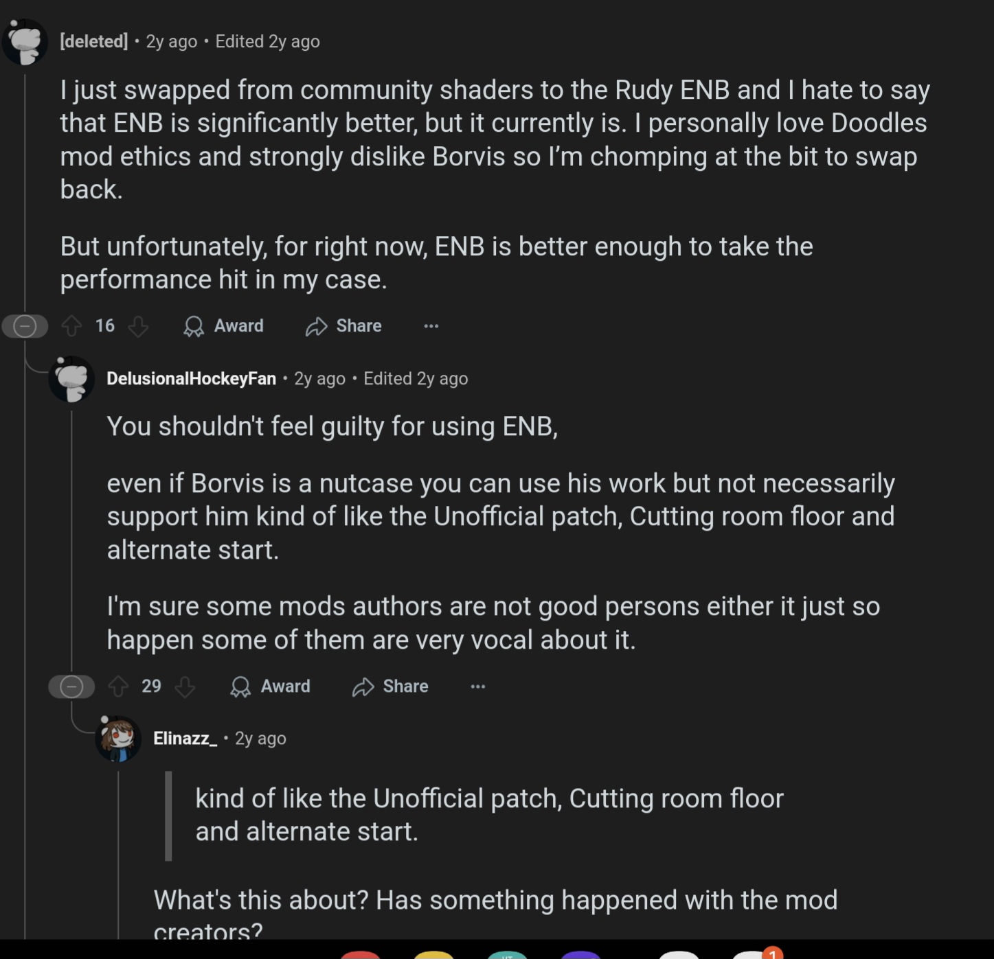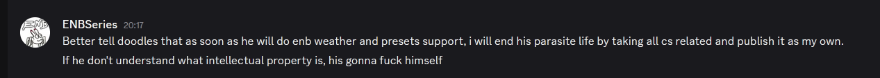 Мало того что они срали на Дудлза несколько лет подряд, они ещё и планируют сделать Скайвинд несовместимым с Community Shaders. Это конечно было бы серьёзной угрозой если бы Скайвинд не был эквивалентом Star Citizen от моддинг сообщества