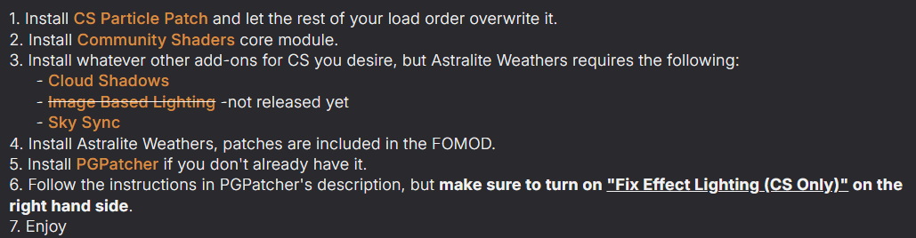 В наличии шапка с: ➔ Описанием общего порядка действий при установке модов. ➔ Зарубежными (и не только) гайдами и подборками модов от опытных допиливающих. ➔ Руководством по конвертации модов для классического Скайрима. ➔ Руководством по даунгрейду игры с сохранением нового контента. ➔ Эксклюзивными подгонами от анонов (некоторые платные моды). https://github.com/Meridiano/SkyrimSE-Head/blob/master/01_Оглавление.md