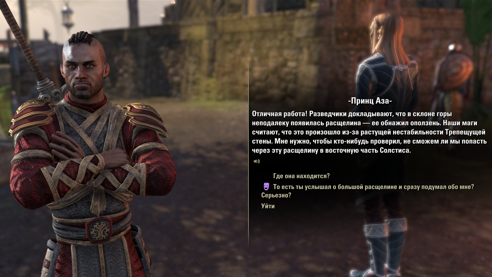 >>2027082 Пока ты проходишь западный Солстис, стена висит, и восточный Солстис недоступен. Когда ты заканчиваешь сюжетку и покидаешь зону, у тебя меняется пул инстансов с "есть стена" на "нет стены". Когда ты прыгаешь обратно в зону, уже в новый инстанс с "нет стены", НПС вокруг пиздят "видали? а стены-то нет!" и к тебе подбегает одноразовый ноунейм и говорит "стена В С Ё, найди Рашимила". Это начинает сюжет восточного Солстиса.