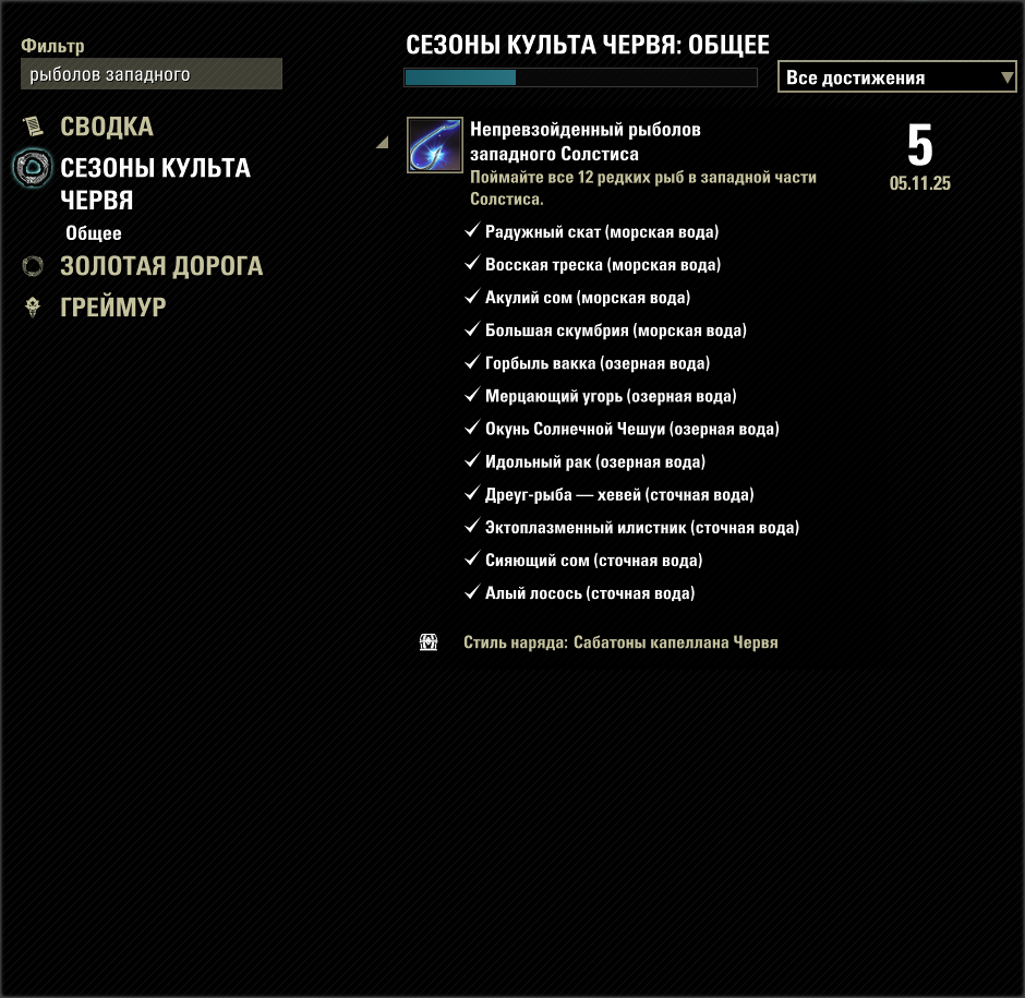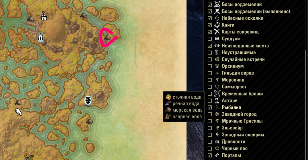>>2029076 1. Достижения > Поиск по названию > Рыболов [название локации]. Здесь есть список особой рыбы, в какой воде она ловится, и выловил ли ты её уже. 2. Аддон Map Pins > Показывает на карте рыбные ноды с разделением по типу (а не просто ноды, как в Harvest Map).