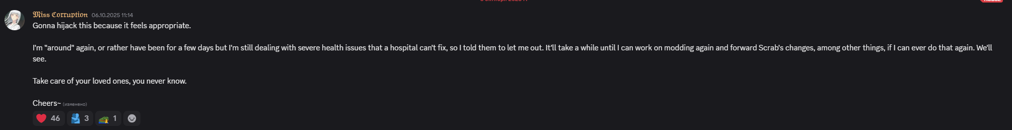 >>2027109 Собрку собирать неделя, дальше играешь. Проблема в том, что когда уже собрал остановиться докидывать моды психологически сложно, а они выходят или обновляются каждый день. В итоге ты как гордый обновлятор сидишь все обновляешь, следишь. Тут всплывает вторая проблема, сборка когда отлажена, она отлажена, но если переменные меняются снова надо дохуя тестить и отлаживать, без этого баги и вылеты. Угадай как обстоят дела у тех, кто продолжает обновлять?