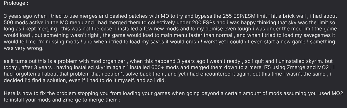 >>2031019 Про руки тебе правильно написали. NSFW моды НЕ КОНФЛИКТУЮТ с геймплейными модами, потому что геймплейные NSFW механики это чистые скрипты (SL Harrasment, Approach, Defeat). Зоо конфликтуют, потому что перезаписывюат животных вроде More Nasty Creatures, и всякое пакетное говно вроде Troubles Heroine, Dovakin Infamy и квестовые моды, так как затрагивают NPC, но их несложно вручную пропатчить (строки scripts, package, perks, например). SSEdit должен стать родным, проверяя КАЖДЫЙ мод на конфликты, без этого собрать большую сборку нельзя. Установил раздел – проверил конфликты, следующие раздел - проверил конфликты, патчишь перетягиванием строчек, это же легко. 60% конфликтов решает правильный load ordrer, 25% поиском существующих патчей (видишь кучу перезаписей одним популярным модом другого, то идёшь в requirements и через ctrl+f находишь патч, так как ты не первый, либо поиск по комментариям в posts), и лишь 15% собственным патчингом. Главное не модить, если не чувствуешь от этого удовольствия.