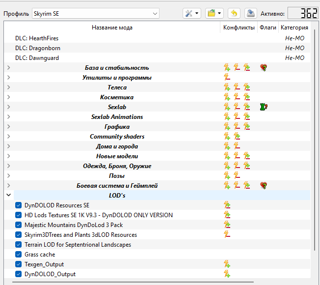 +pandora_out +bodyslide_out +PGPatcher_Output -аутпуты_separator +WetFunctionRedux SE +Extensible Follower Framework FIX MCM menu +EFF Patch for IIAA +EffDistancefix +Extensible Follower Framework +DaegonRU +Daegon Kaekiri +Simpler Knock .esp +Bathing in Skyrim - RUS +Bathing in Skyrim - Renewed +iNeed - Food, Water and Sleep - Continued +Campfire - Complete Camping System RU +Campfire 1.12.1SEVR Release +Frostfall 3.4.1SE (RU) +Frostfall 3.4.1 SE Release -немного разного_separator +Embers XD (RUS) 3.0.6 +Lux - Via (patch hub) +Lux - Via (Russian Translation) +Lux Orbis (patch hub, only Creation Club Content) (Russian Translation) +Lux Orbis (patch hub) +Lux Orbis (Russian Translation) +Lux (patch hub, only Creation Club Content) (Russian Translation) +Lux (patch hub) +Lux (Russian Translation) +Dynamic Impact - Slash Effects X +FleshFX +Lux +Lux Orbis +Lux - Via +Embers XD +Misc Effects ENB Light +Elytra and Bliss Bug ENB Light - Scrambled Bugs Version +ENB Light for Apocrypha +Dark Elf Lantern ENB Light +ENB Light +Arctic - Frost Effects Redux +ENB Particle Lights for Alchemy and Enchanting Tables +Ayleid Ruins ENB Light +Particle Lights for ENB - Riekling Outposts - MAXIMUM INTENSITY +Particle Lights for ENB - Spectral Warhound Eyes - Default Intensity +Particle Lights for ENB - Fire Traps - FULL +Particle Lights for ENB - Falmer Drips +Particle Lights for ENB - Dwarven Spiders +Particle Lights for ENB - Moon Crests +ENB LAVA or LightPlacer Lava +Particle Lights for ENB - Wisps - Witchlight +Particle Lights for ENB - Light Orbs - Motes +Mr. Dragonfly ENB Particle Light +ENB Lights For Effect Shaders +Particle Lights for ENB - Nordic Ruins Candles +Particle Lights for ENB - Staff Enchanter +Particle Lights For ENB SE - Undead Creatures +Particle Lights For ENB SE - Bugs in a Jar +ENB-ParticleLights-DwemerLanterns-1-02 +Fluffy Moths - ENB light for Luna moths +Rudy HQ - More Lights for ENB Decal Fix +Rudy HQ - More Lights for ENB SE - Glowing Mushrooms +Parallax Spell Impacts +Deadly Spell Impacts +Burned Corspe UHD +Smoking Torches and Candles SSE +HIMBO Patch +CBBE-3BA Patch +Dismembering Framework - Latest Version +Official Creature Asset Pack - Latest Version +Official Humanoid Asset Pack - Latest Veersion +Next-Gen Decapitations - Latest Version +Death Drop Overhaul - Latest Version +Inertia - Latest Version +Precision +Enhanced Blood Textures -резня+освещение_separator +Comprehensive First Person Animation Overhaul +Immersive Interactions - New Anims +Ultimate Animated Potions NG +Disable Turn Animation V1 SE I AE +Jarl Sitting Animation Replacer - OAR +Smooth Weapon Jump Animation +More Feminine EVG Clamber Animations +EVG CLAMBER - Slope Animations +Dynamic Sprint Stop +Dynamic Sprint +Lively Children Animations (OAR) +Conditional Tavern Cheering (OAR) +Random Emotions with followers(переустановить) +Conditional Expressions Extended +Conditional Expressions +Vanargand Animations II - Unarmed Pugilism Stance +Vanargand Animations II - Unarmed Non Combat Locomotion +Vanargand Animations II - Unarmed Normal And Power Attacks +Vanargand Animations - Sneak Thrust Attacks +Vanargand Animations - Sneak Strike Attacks +Vanargand Animations - Sneak idle walk and run +Vanargand Animations - Sneak Crossbows +Vanargand Animations - Sneak Archery +Vanargand Animations - One Handed Power Attacks +Vanargand Animations - One Handed Normal Attacks +Vanargand Animations - One Handed Mid Stance +Vanargand Animations - Dual Wield Sneak Thrusts +Vanargand Animations - Dual Wield Sneak Strikes +Vanargand Animations - Dual Wield Normal and Power Attacks +Vanargand Animations - Crossbows +Vanargand Animations - Archery +Leviathan Animations II - Greatsword Sneak Locomotion And Attacks +Leviathan Animations II - Greatsword Normal Attacks +Leviathan Animations II - Greatsword Non Combat Locomotion +Leviathan Animations II - Greatsword Low Stance +Leviathan Animations - Two-Handed Power Attacks +Leviathan Animations - Two-Handed Normal Attacks +Leviathan Animations - Two-Handed High Stance +Goetia Animations - Sneak Magic +Goetia Animations - Magic Spell Casting +Goetia Animations - Conditional Shouts +Goetia Animations - Enchanted Magic Staves +Goetia Animations - Male Idle Walk And Run +Goetia Animations - Sprint +EVG Conditional Idles +Aroused Sexy Idles - OAR 1.6 +Dynamic Female Wall Leaning OAR +Dynamic Female Rail Leaning OAR +Dynamic Female Hand Warming +Offset Movement Animation +Smooth Random Jump Animation +Malignis Animations - Random Idles TB +Improved Camera SE +Riding Animation Overhaul - RAO - Female +Grab and Eat +Paired Animation Improvements +Modern Female Sitting Overhaul OAR +Arm Movement Animations (OAR) +Gunslicer OAR Animations Pack +Hunters Loot +Gesture Animation Remix (OAR) - shield patch +Gesture Animation Remix (OAR) - main archive +NPC Animation Remix (OAR) - shield patch +NPC Animation Remix (OAR) - main archive +P.A.I.A - Pregnancy And Inflation Animation(переустановить) +EVG Animation Variance +Improved Table Sit Transition OAR +Look Around - Searching Animations for NPC - OAR +Gotobed-se +Immersive Interactions - Animated Actions Russian +Immersive Interactions - Animated Actions +Obscure Animations Overhaul +Sleeping Expanded +Take a Seat - OAR Animations +Open Animation Replacer +Animation Queue Fix +Behavior Data Injector Universal Support +Behavior Data Injector +True Directional Movement RU +True Directional Movement +Animation Motion Revolution +Pandora Behaviour Engine Standalone Windows x64 +Assorted Animation Fixes +XP32 Maximum Skeleton Special Extended -анимации_separator +TNG_Himbo_SMP_XMLs +HIMBO V5 - Physics Addon +[Predator] High poly Head SMP +CBBE 3BA Vanilla Outfits Redone +Skinny to Thicc 3BA Bodyslide Preset +Diamond CBBE 3BA Bodyslide +Female Dunmer Presets Pack +Kurone Bell - CBBE 3BAv2 - Body Preset +Elven Assasin 3BA +Dragonslayer Bow and Siege Arrows SSE -Nemesis Unlimited Behav