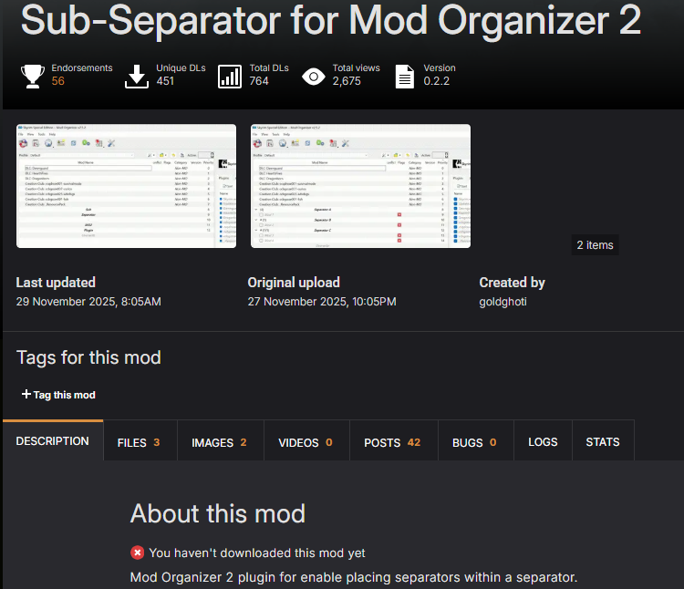 >>2029562 Дефолтная страница в нексусе. Спасибо что без простыни текста. А то так охото ради одного мода 10 минут читать. Можешь добавить историю о том под чем создавался этот мод и отношение твоей кошки к нему