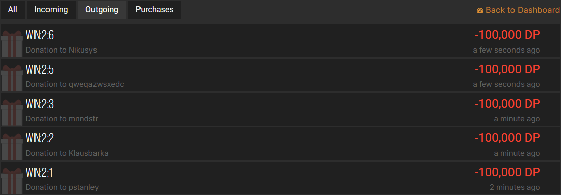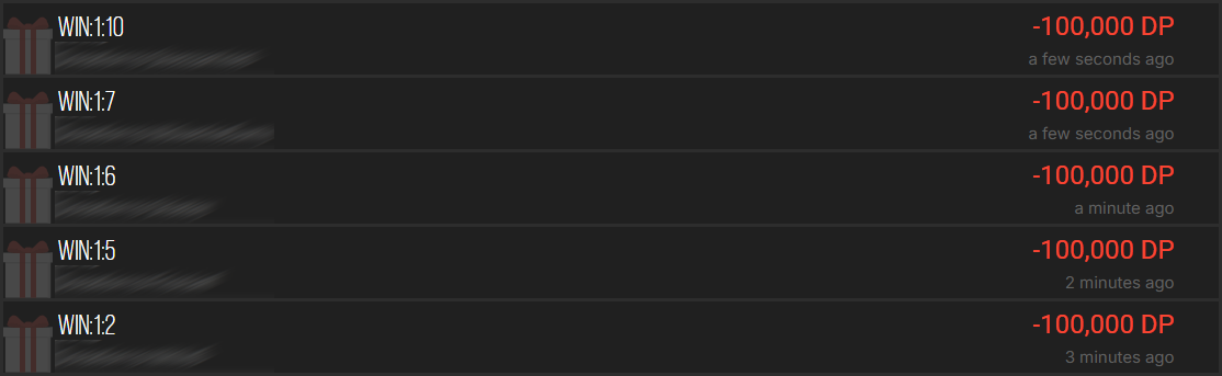 План такой: 1. Вы пишете мне в ЛС на NexusMods сообщение с темой "sup /tes/ 2025" ( https://forums.nexusmods.com/messenger/compose/?to=9609463 ), и я по возможности включаю вас в ротацию. 2. Каждую неделю в воскресенье я случайным образом выбираю 5 человек из списка включённых. Этим людям я сразу отправляю 100К ДП. 3. Если вы не попали в число победителей, то ваш аккаунт включается в ротацию следующей недели, т.е. общий призовой фонд 100К х 5 х 4 = 2КК ДП. 4. Если призовой фонд не будет исчерпан, т.е. мне в сумме напишет меньше 20 человек (в прошлом году было 12), то в последнее воскресенье остаток будет разделён между написавшими поровну с округлением до 1К ДП. 5. Возможно, всё пойдёт не по плану, потому что я просчитался, но где? Тогда придумаю что-нибудь на ходу.