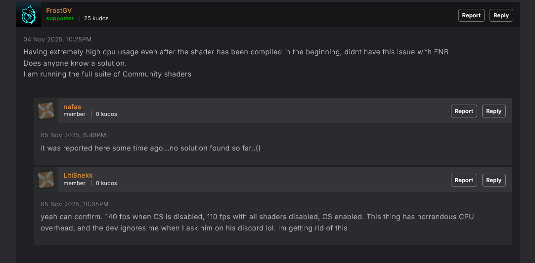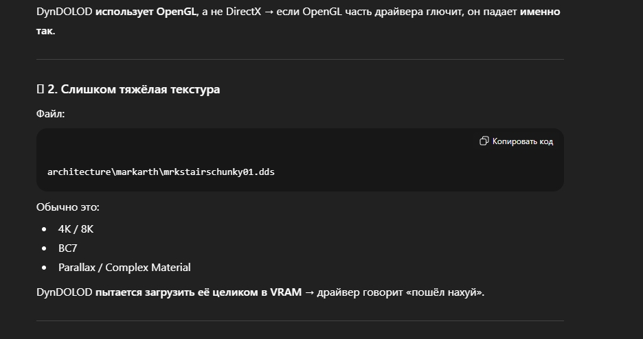 Ладно, пока нашёл вот что: >If you use Community Shaders and have not updated to the newest version, you must disable bOverrideRenderPassCache in the toml or you will crash with Engine Fixes 7.0.19. Отключил, буду наблюдать. Если вылеты продолжатся, попробую дллки убрать.