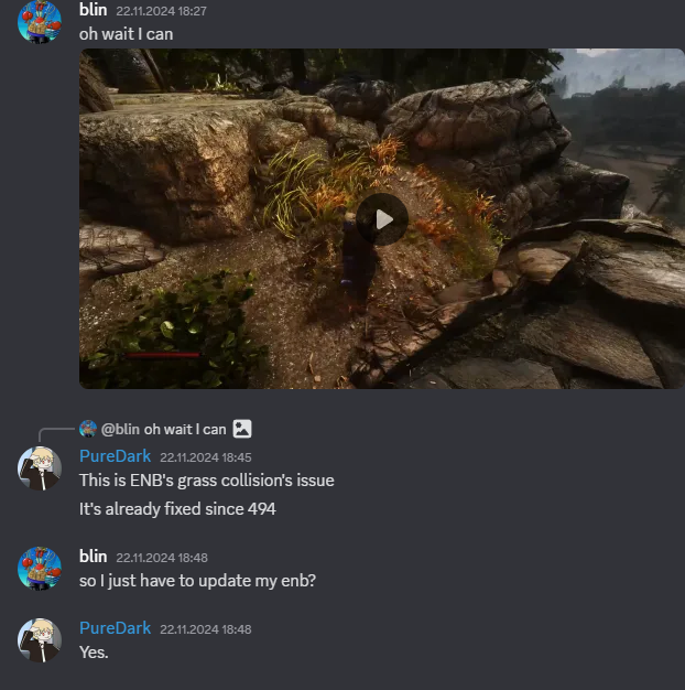 >>2032623 (OP) Использую SkyrimUpscalerAIOBuild05 от Pure Dark, траву под ногами пидорасит из-за фреймгена как на видео. Если убрать апскейлер проблемы нет. Я как то закрывал на это глаза, но тут смотрю что это совсем пизда, надо сделать что то. Это физика травы кажется из ENB, она просто видимо слишком быстро двигается для апскейлера. Есть идеи кроме отрубания физики травы/апскейлера?