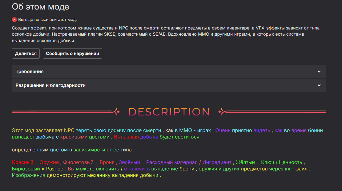 В наличии шапка с: ➔ Описанием общего порядка действий при установке модов. ➔ Зарубежными (и не только) гайдами и подборками модов от опытных допиливающих. ➔ Руководством по конвертации модов для классического Скайрима. ➔ Руководством по даунгрейду игры с сохранением нового контента. ➔ Эксклюзивными подгонами от анонов (некоторые платные моды). https://github.com/Meridiano/SkyrimSE-Head/blob/master/01_Оглавление.md