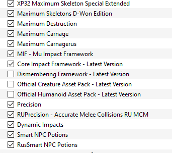 >>2035889 У меня вот так выглядит набор. Модов на изменение моделей НПС и существ нет. Дисмемберинг в принципе то же самое делает, но без крушения черепов и пр гуро, поэтому отключено.