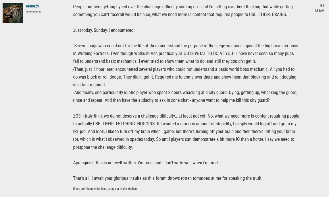 Аноны, я ньюфаг, вкатился в игру буквально неделю назад, ща вот поднял 48 лвл и имею вопрос. В игре будет сложный контент? А то это пиздец, я чуть ли не засыпаю пока играю в игру , в открытом мире как мне кажется умереть вообще никак нельзя, ходил в данжи надеясь что там будет сложность так там типы их пробегают так быстро что я даже квест прочитать не успеваю. Вообщем данжи тоже вгоняют в уныние. Так вот, дальше чета хардкорное будет? Или весь контент эт читать графоманию и обустраивать домик? Я слышал про триалы и ветеранские данжи, но хочу узнать у завсегдатаев они сейчас по сложности норм? Мне вот нравится когда рейд нкжно проходить на жопоразрывательной сложности, чтбб была куча вайпов, драма и т.д буднт такое илт зря качаюсь и игра не про это?