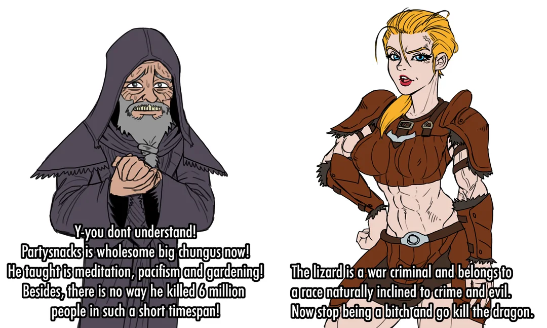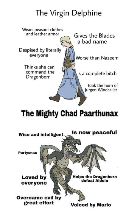 Ты отыгрываешь у себя в голове что Дельфина писечка-хуисечка, багиня, но она даже не вступит в брак с Довакином как Эйла после того как выполнишь её приказ, она даже не станет твоим спутником как Серана, какой в этом смысл? Максимальн6о куколдский выбор убивать дракона только потому что у старого маразматика и климаксички бзик, если они такие идейные так пускай идут других драконов режут которые всё ещё летают и жгут города, где эти Клинки были когда Довакин на вершине Глотки Мира сразился с Альдуином? А Партурнаакс был рядом и даже вступился за Довакина, против своего старшего брата и вожака.