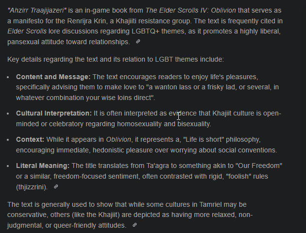 >>2034790 >На, читай: Фандом вики? На читай https://elderscrolls.fandom.com/wiki/LGBTQ%2B Напоследок пошлая бретонская шутка, про каджитских моряков. How do separate sailors in the Khajiiti navy? With a hammer and tongs.