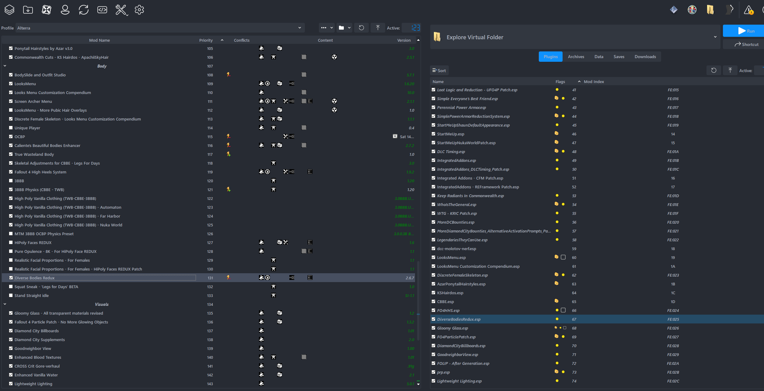 + CBBE работает. Появились тела. + BodySlide работает. Измененные тела и одежда видна в игре. Слайдеры работают, изменение ползунков в игре работает. + TWB работает. Есть слайдеры для мышц. + 3BBB + OCBP работает. Кости есть, веса работают, сиськи делают боинг-боинг. + High Poly Vanilla Clothing под TWB 3BBB работает. Вся одежка и броня реагируют на TWB слайдеры + LooksMenu - работает. Могу сохранять пресеты, двигать ползунки, потом использовать эти пресеты. - Diverse Bodies Redux - не работает! Я удалил все стоковые пресеты женских тел для ванильного CBBE, оставил файл cond.json и скинул туда заведомо рабочий TBW 3BBB пресет с гипертрофированной грудью. Пресет рабочий, я могу применять его на неписей в игре через LooksMenu.